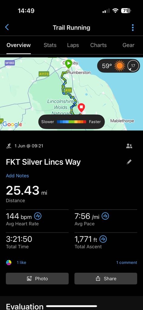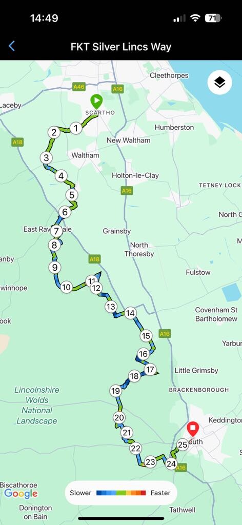 This is a lovely trail to run, very senic and takes in some beautiful villages in the Lincolnshire wolds. I set of from my start point at Scartho with my race vest stocked for the run ahead of me with plenty of water and food as I wanted this to be unsupported and to test how long it would take me to complete the entire route solo. The sun was already getting warm right from the off and there was a goodly south / south west wind blowing so probably not the perfect conditions for trying the FKT but I was there so I took what mother nature was providing. As I was getting ready to start I realised the Great Grimsby 10k was already running so i took a few minutes to watch them before taking my place, starting my watch and going on my own adventure, St James church in Louth seemed a long way away at that point. I soon got into my stride and settled down to a pace I felt comfortable with, the miles soon starting ticking by, in places the grass was knee high which ment tougher going, but these unkept places were fewer than expected, the farmers do seem to keep this trail fairly runnable so thank you to the farmers for doing that. With the sun out this ment more people on the trail to say good morning to which broke the silence of running in my own thoughts. A few of the fields still had lambs in them which was a joy to watch as I passed through their fields, seeing them playing and jumping always brings a smile to my face, so many people miss these small events that go on but runners / walkers / ramblers we see it and appreciate it. The red kite population seems to be thriving as there was an abundance of them flying about and hovering in the southerly breeze.soon I was halfway through the adventure so into my race vest and out with a mini can of full fat coca cola a little treat I only enjoy on my longer runs, with that and a banana and a piece of kendal mint cake fueling me I new it would kick in and keep me sailing along. As the miles rolled by I soon found a nice little slog uphill to North Elkington and then met with a few miles of road, by this point and 19 ish miles in I still felt pretty good and trotting along with a goodly spring in my step. I was soon passing through a beautiful little forest and crossing a not so busy main road, once across the road and up another few hills there on my lefthandside was St.James church spire / steeple it might be still a few miles away but I remember seeing that several miles back in the distance and now only a few miles away, almost touching distance.... well maybe a little further but its a nice feeling when you can see the finish and even better when your legs are still feeling strong and wanting to run, it wasn't long before I entered the gate at Hubbards hills and wow how busy was that place with families, it was great to see so many parents with their kids outdoors running / playing / paddling in the stream and not on their phones. With only a mile or there about to go I put my final spurt on ' time to head for home ' well maybe not home but the end of my adventure. What a great site to see the steps of St James church and soon I was stopping my watch and enjoying a well earned sit down on the wall at the church. A fantastic adventure that I hope many people go on.