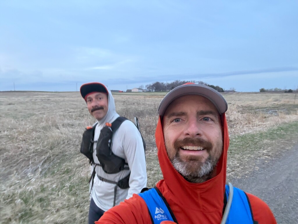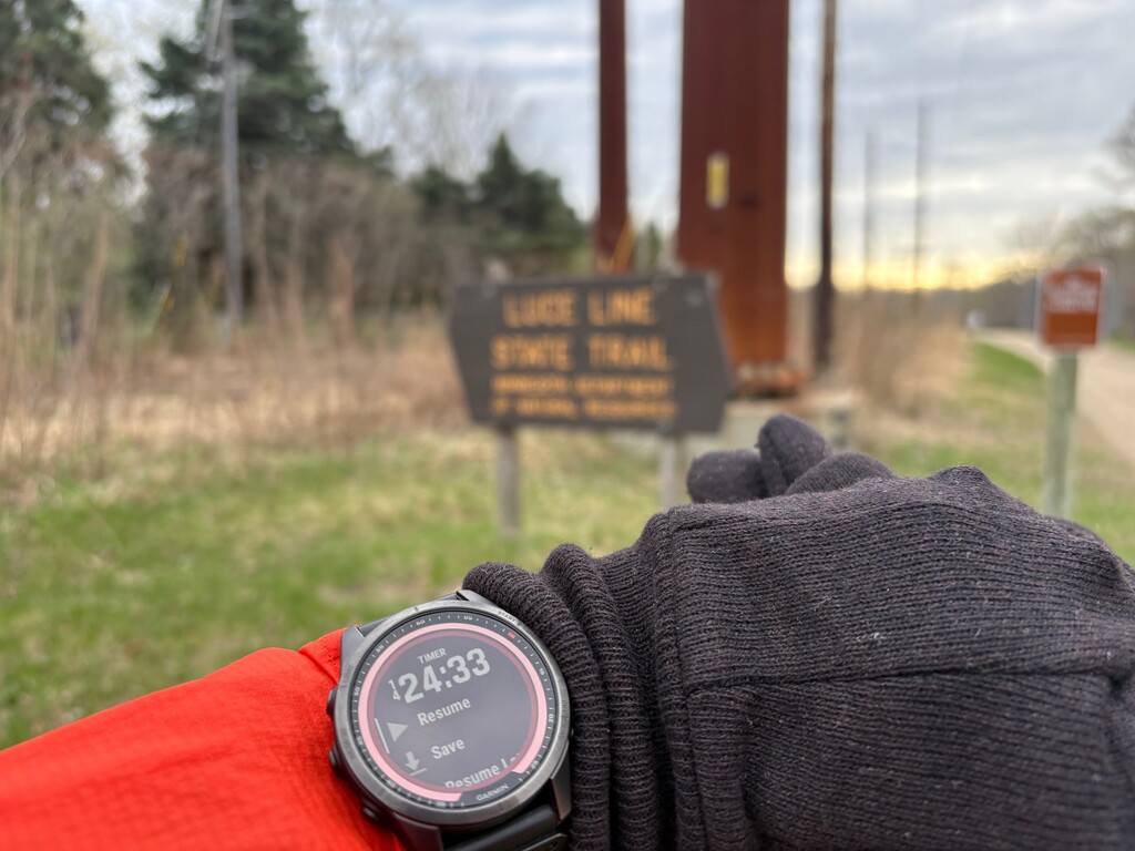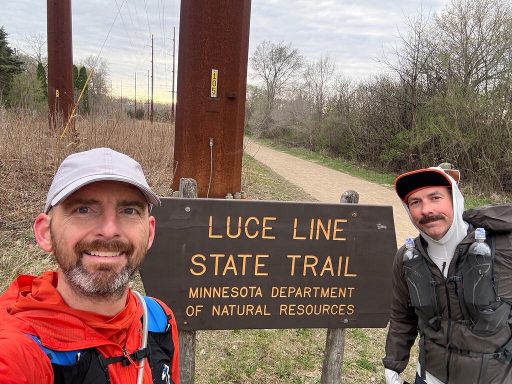 4/17/2026 - Luce Line Trail, Cosmos to Vicksburg Lane (W to E). 4 AM start, and that ended up being the warmest part of the day. Cloudy, rainy and windy throughout the day, and a pile of $6 receipts from gas stations we resupplied at along the trail, including a farm co-op gas station where we both purchased some new gloves. We settled into a good run/walk mix, with a 5 minute run/5 minute walk maintained for the last 27 miles.