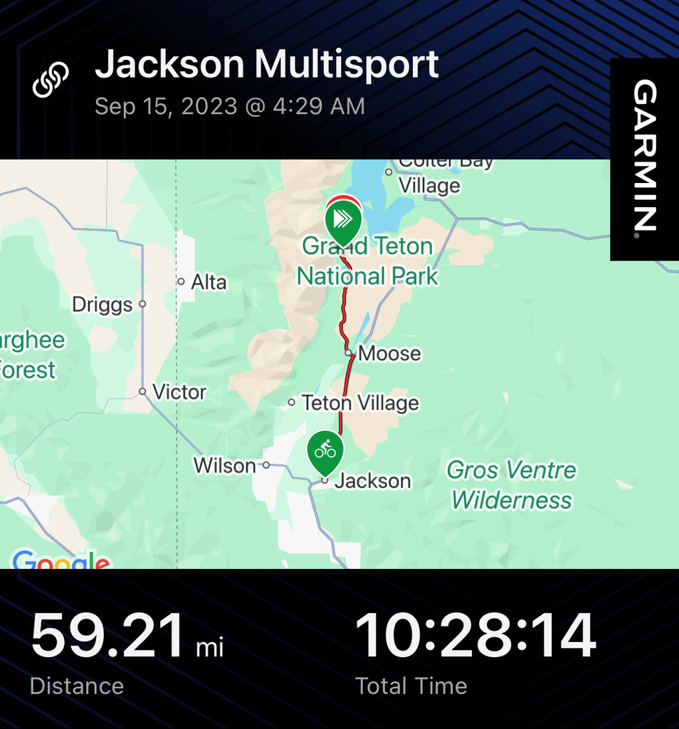 What an incredible day! I drove up from Salt Lake the afternoon before. Slept for a little bit and started just before 4:30! I finished in just under 10.5 hours and drove home the same day. I biked to the string lake parking lot, locked up my bike, then ran with my wetsuit and pack for the 1 mile of trail to Leigh Lake. The swim out in the morning was incredible. I was underneath Moran's embrace right as the sun came up and made the water look like fire with each stroke I took. I made it to the top of Moran in just over 2:20 and took a good long picnic break at the summit. I soaked in the views of the Grand and the valley below while reveling in the enjoyable scrambling I had just done. Looking down on Leigh lake, I knew the swim back would be rough, as the wind had already created a strong current. Inevitably, I got sucked into it and the swim back took me an extra 800m and 30 minutes longer of swimming! Once out of the water, I ran the 1 mile of trail back to my bike, loaded up my pack and wetsuit, and hauled it all back to town. One of the best solo and unsupported adventure days I've ever had. I saw no one on Moran and had the whole beautiful thing to myself. What a treat!