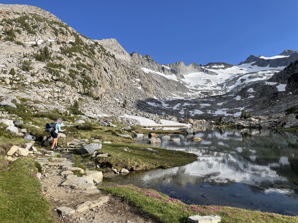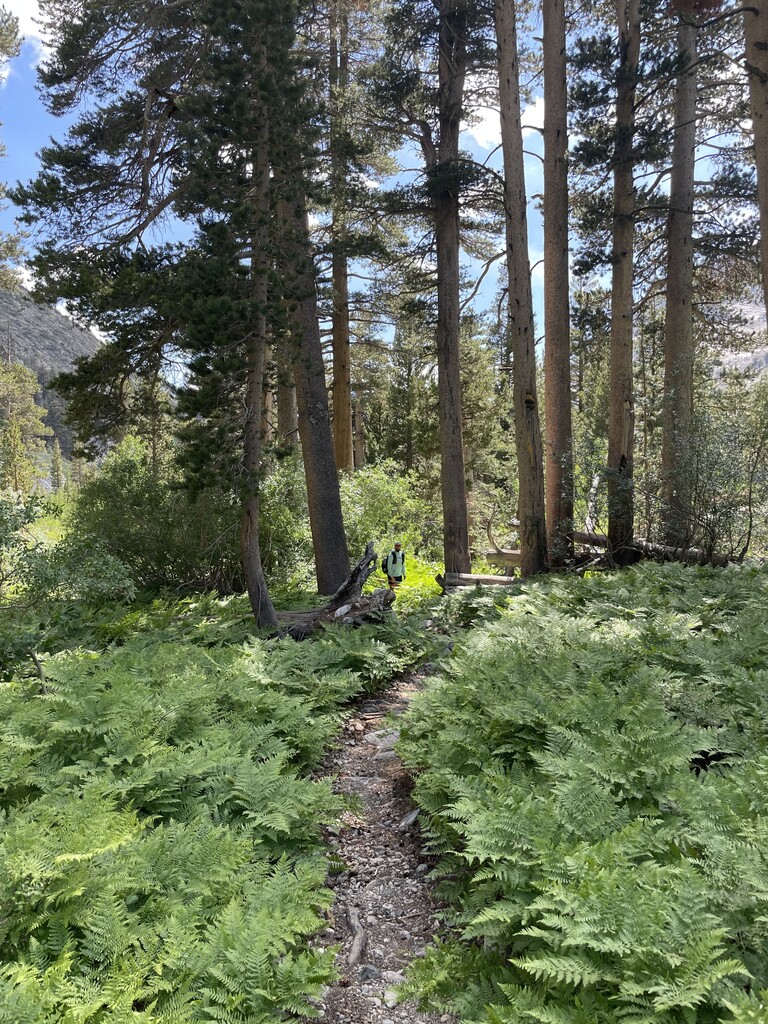 Another really beautiful day that took us near Purple Lake and Lake Virginia. Nuumu Hu Hupi Lake was also a beautiful lake that was somewhat hidden near the top of the pass. We made it over Silver Pass which had some snow towards the top but very manageable to get through. Then we descended from Silver Pass into the valley past Quail Meadows and past the sign for the Lake Thomas Edison Ferry.