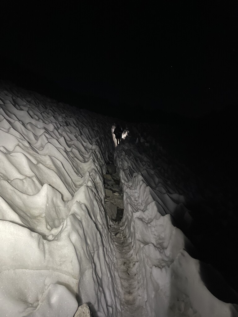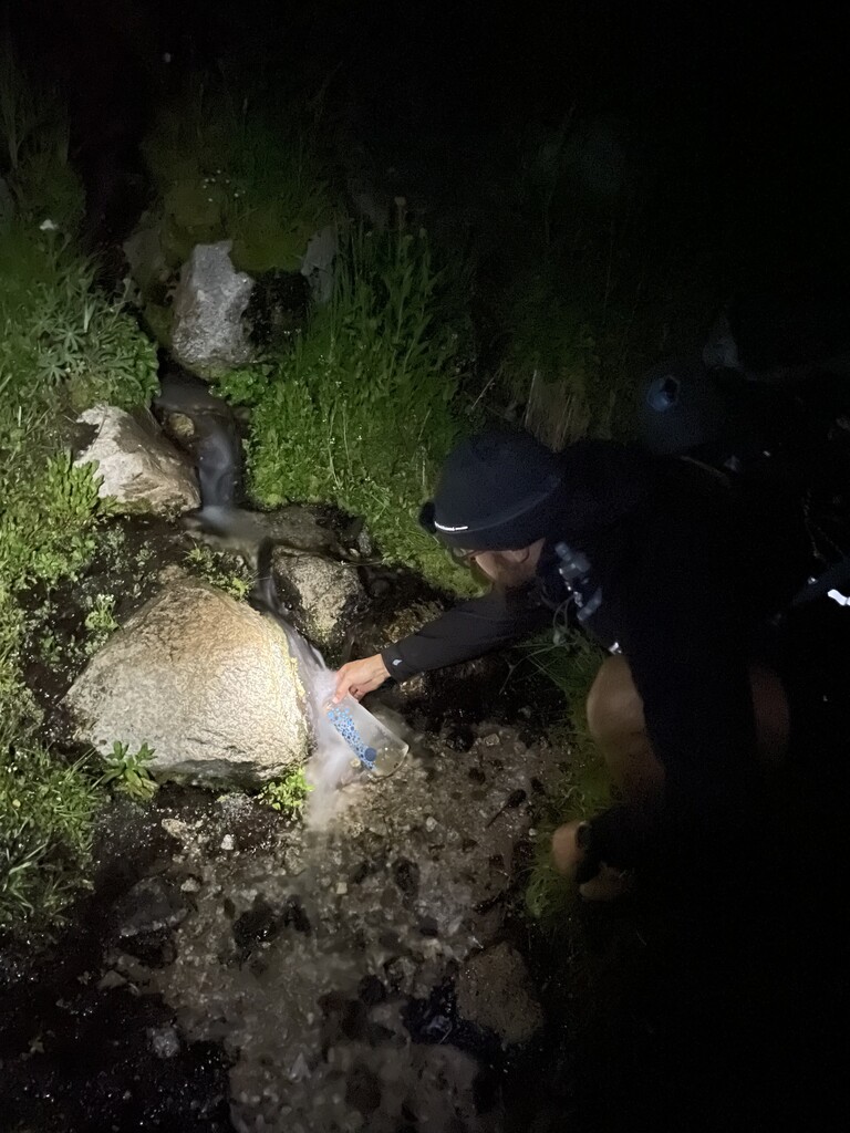 It was a fun night hike/run through the terrain, and we were excited to reach Seldon Pass early morning which greeted us with a beautiful view. Mosquitos were in full force again this morning but good thing we had our nets! It was a very hot day and we thought we’d run out of water at one point which was concerning. However, we finally made it to a river crossing where we spent some time refilling water and cooling off. It was HOT! We reached Evolution Meadow which had a lot of flooding making it difficult to traverse and get to higher ground. We continued to ascend towards Muir Pass but as night fell, we started to get sleepy so setup a quick camp to rest for a few hours before starting back up early the next morning. OH, and just before camp we saw a set of what we thought were mountain lion eyes which was a little nerve racking!