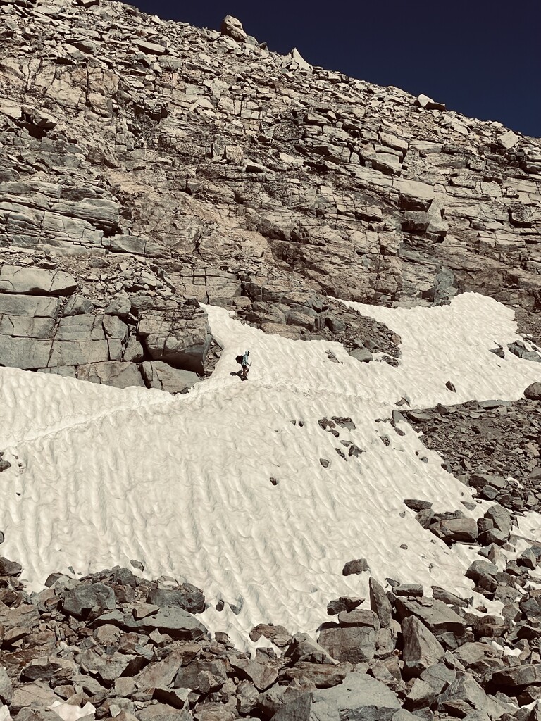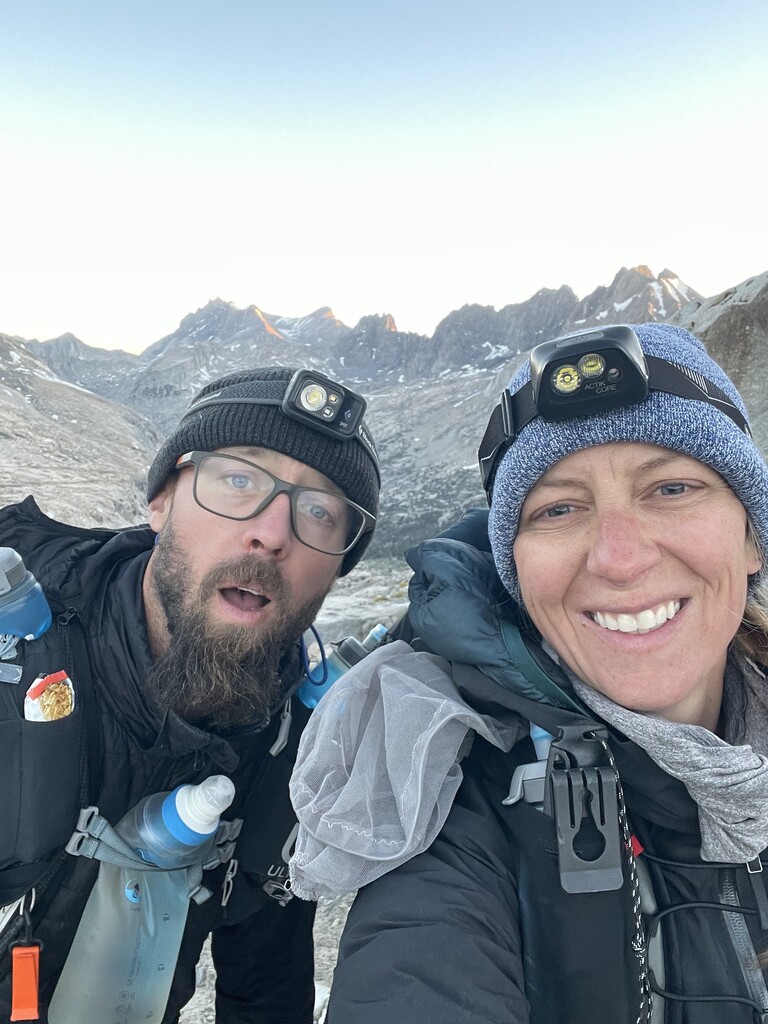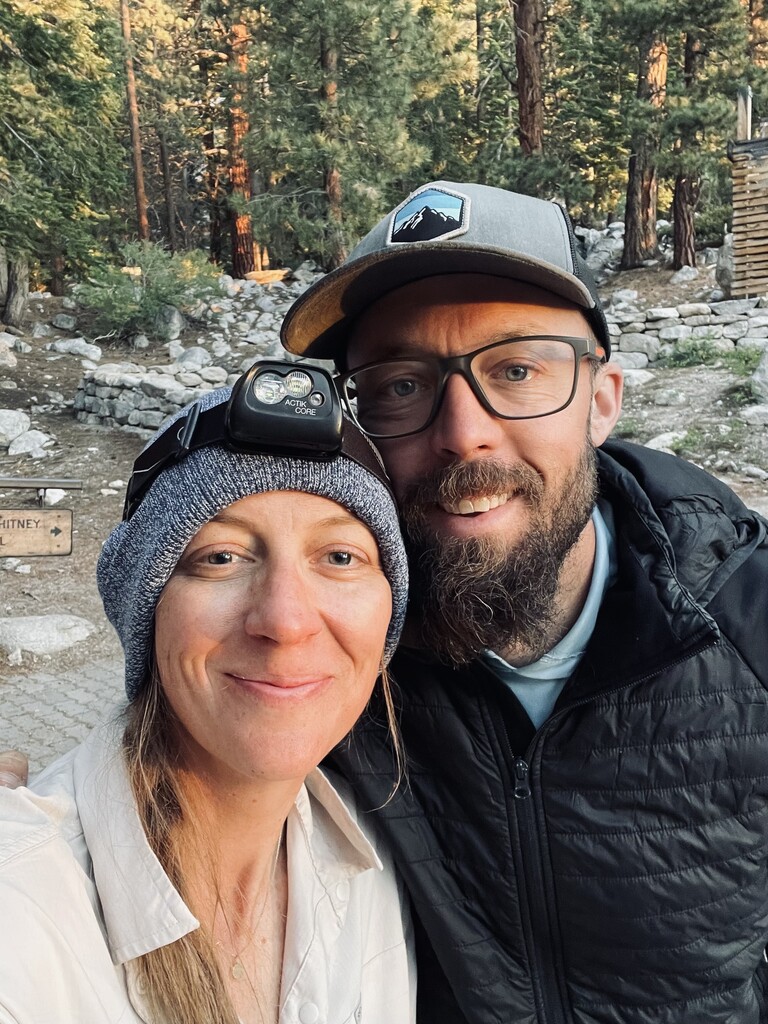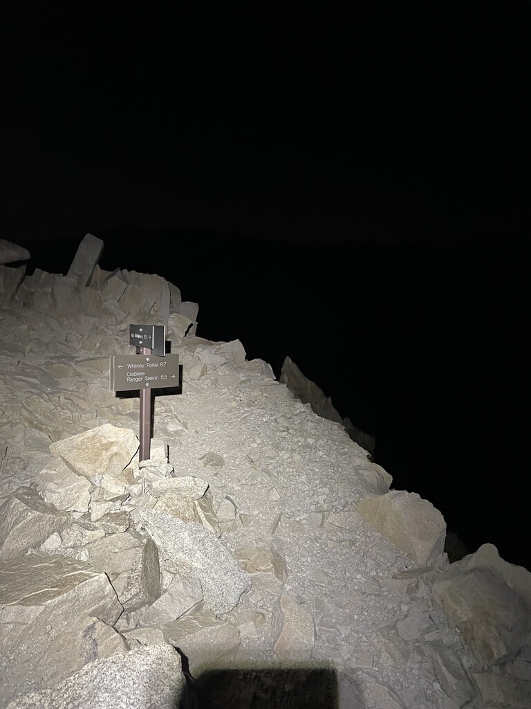 We started Day 8 (July 4th) early AM and ended up making a big push through the night and following morning to end on Day 9 at 5:21AM PT. This would end up being our longest day yet at roughly 47 miles. As we started Day 8 we headed down the remainder of Glen Pass before starting the ascent to Forester Pass. The accent up Forester Pass had more snow than we anticipated. There were several small snow melted lakes that were absolutely beautiful. We saw in the distance a hiker cold plunge naked into one of them! FREEZING! As we hit the top of the pass we were relieved but also knew we had a long last push down and then up to Mt. Whitney. It was 4th of July, and Matt’s birthday, so our goal was still to summit Mt. Whitney before midnight! It was a fairly easy shuffle down from Forester Pass. The terrain definitely became dryer and the heat intensified. We finally came up on Guitar Lake which was a huge base camp area for those planning to summit Mt Whitney the following day and/or had just completed their summit from earlier that day. We didn’t take a break and kept moving forward with the summit by midnight top of mind. We felt like all eyes were on us as we were the sole hikers/runners heading towards Whitney as the sun was setting! It was a steep but short climb up to the junction that we worked hard to reach just past sunset. Having reached the junction it was now time for the ~1.8 miles out to the summit and back. We were nervous to do this in the dark but we were prepared, capable, and weather conditions were great although slightly cold. There was actually a lot of snow we had to traverse which made things more challenging and having to make smart, safe steps on and along the route. Before we knew it we made it to the summit just after 11:00PM PT! We did a quick loop around the Smithsonian Institution Shelter before I surprised Matt with a freeze dried ice cream sandwich, “38” candles, and A “happy birthday to you…!”. A very short celebration before quickly getting out of there! We were so happy to make it to the summit just before midnight and so proud of ourselves! It was such a long, hard day (and week). It was now time to head back down to the junction and start the long walk to the Portal. We managed our way back to the junction and shortly after started the descent. We counted the 100 initial switch backs down. The trail was super sketchy at night as there was black ice on rocks and there had been rock slides that destroyed sections of the trail making it fairly unsafe to pass but we found a way. As we were coming down we could see headlamps coming up assuming for a sunrise summit. It felt like forever to get down to the Portal but we did it! WOW—what an adventure!