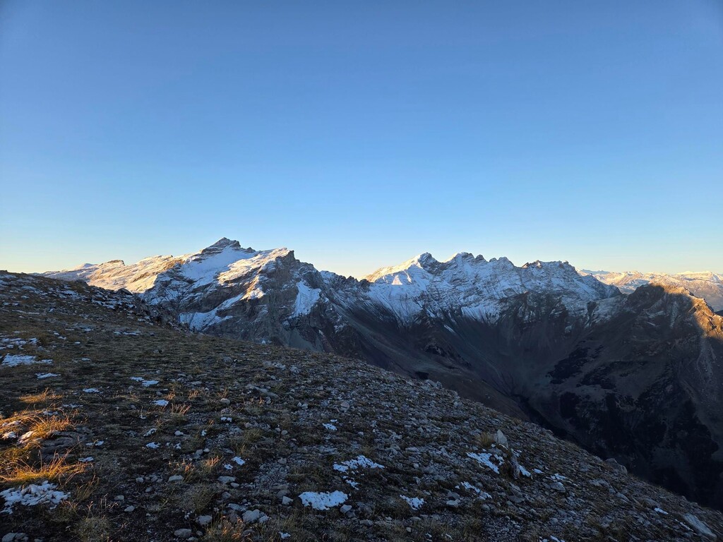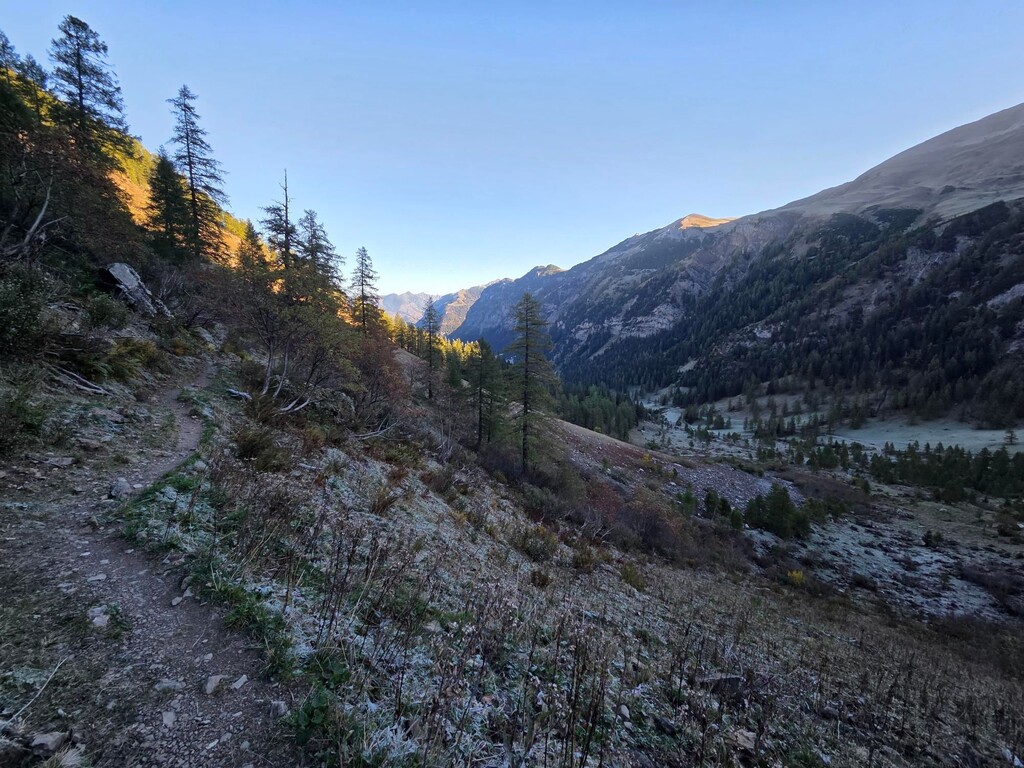 The sunrise was pure magic - golden light spilling over snow-dusted peaks while two massive herds of chamois made their grand appearance as if they’d been hired for the occasion. The trails were in perfect shape: frozen ground for speedy progress, and plenty of mountain streams to refill bottles.