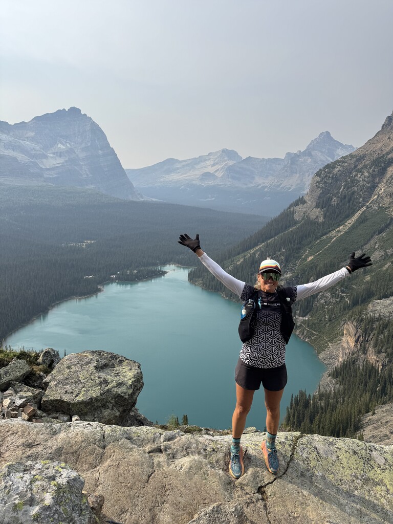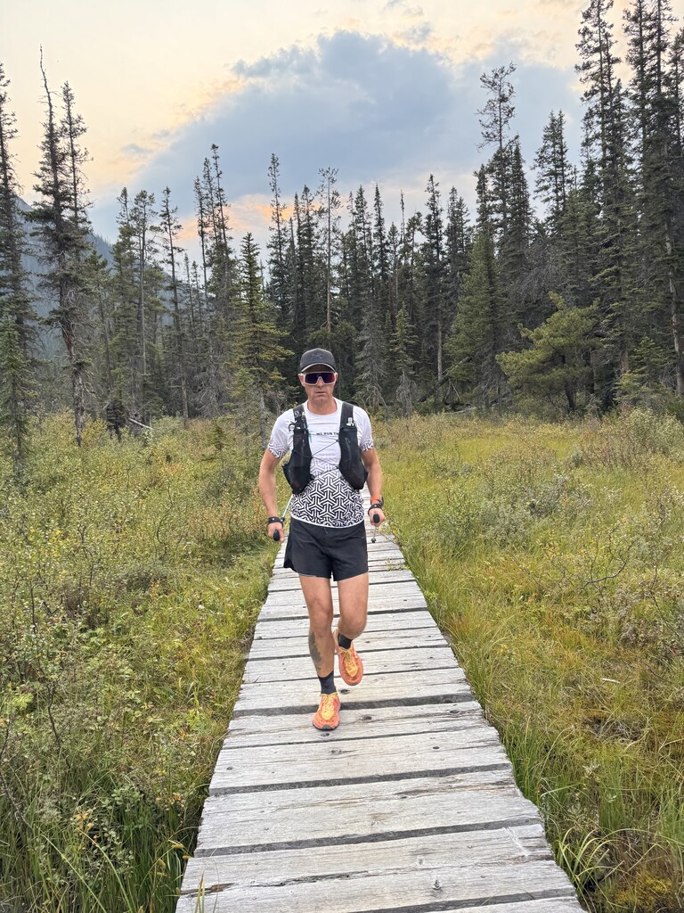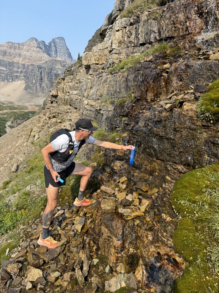 Getting a quick rest and reset at the lake edge, we headed over the Yuckness Alpine route to pass by the Lake Oesa area and look at the backside of Abbott Pass. A straight descent from Oesa to Lake Ohara took us past the campground. We then jogged down the access road looking for the little-used Ross Lake trail for the return to complete the loop. Breaking off on the trail, we ran slightly short of water and restocked water at Ross Lake for a few minutes. There had been a bit of tree fall requiring some crawling, but overall, the trail was good. A quick descent around the hotel, and we returned to the outflow bridge to complete the whole circuit.