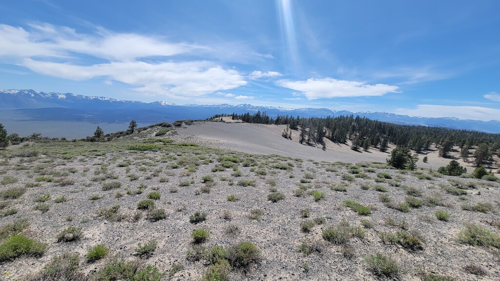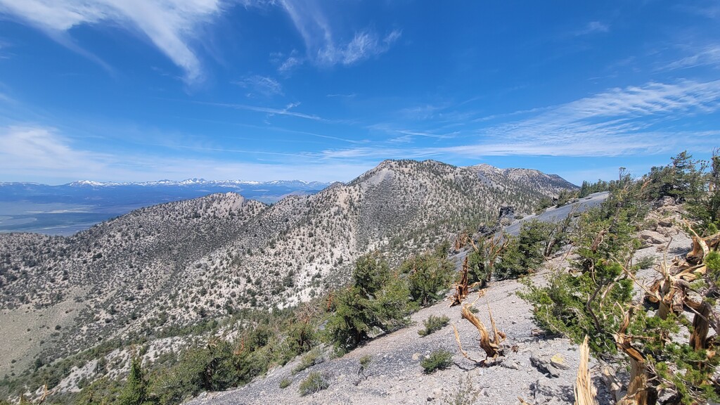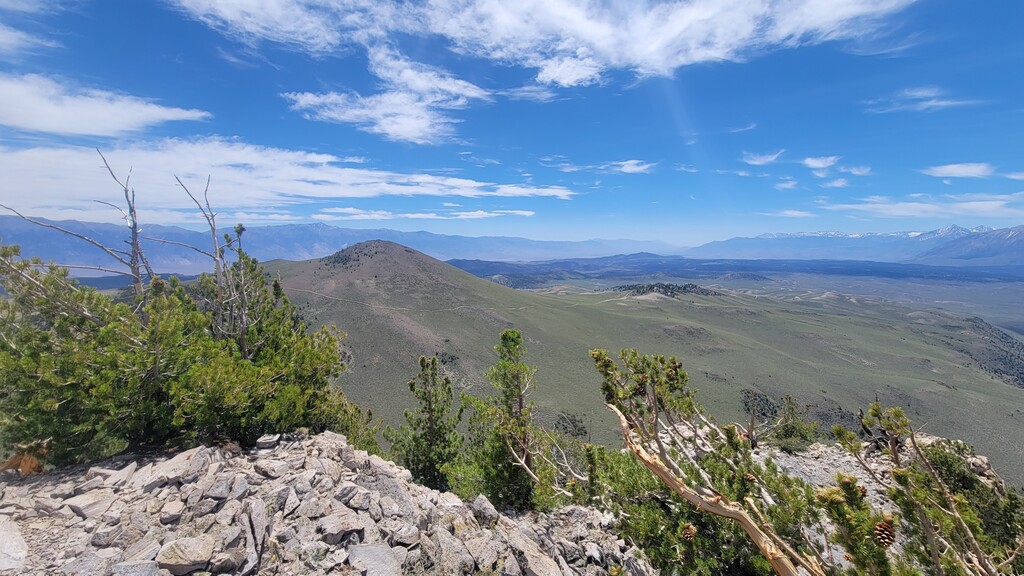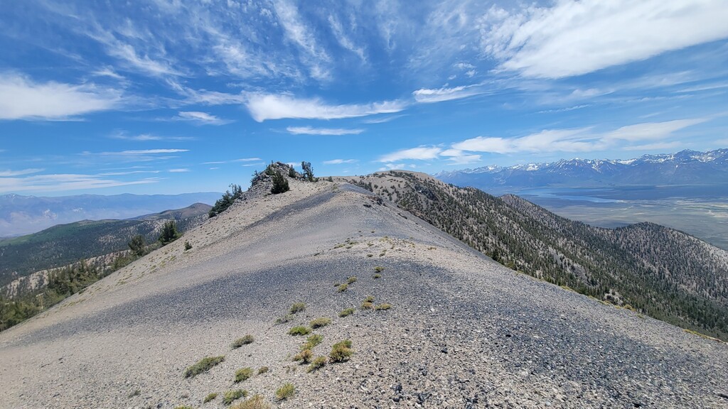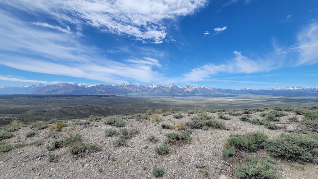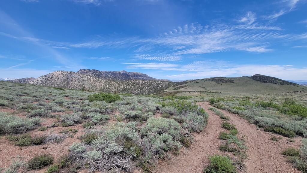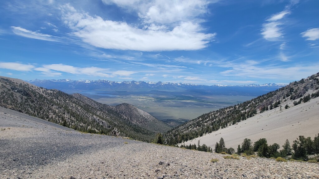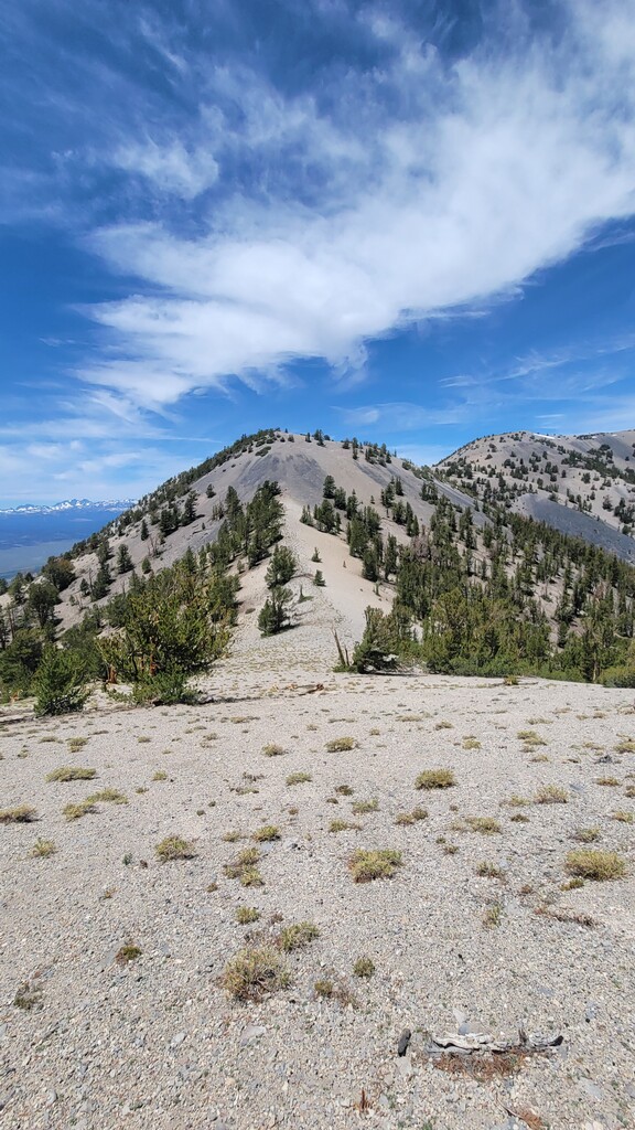 The initial climb up from Watterson Troughs was a real treat. Partially runnable at a nice grade, fairly solid footing, and great views right from the start. The road peters out between Cone and Wilfred, at which point the real fun began. The off-trail connection from there to Crooked Meadows was generally loose and gravely/sandy, often quite steep, and pleasantly open – running was generally possible for modest uphill and all downhill grades. This section had the real killer scenery, too: as advertised, unobstructed views of the Sierras, Whites, Crowley Lake, Mono Lake, and more. As the linkup goes on, you trade scenery for speed, and the first several steep peaks give way to more rolling loose terrain. Eventually I reached solid footing again on forest roads for the last ~10 miles, by which time some fatigue had set in. Sure, the last bit is a slog, but I thought the rolling meadows and ghostly burn zones were scenic in their own way, and you can really make up time on the packed surface. Overall, great route, great weather, great day. The views were killer, the terrain was interesting but not technical, and the solitude was serene. Thanks to Emma for the support, and to Jessica and Eli for the beta on this cool linkup!