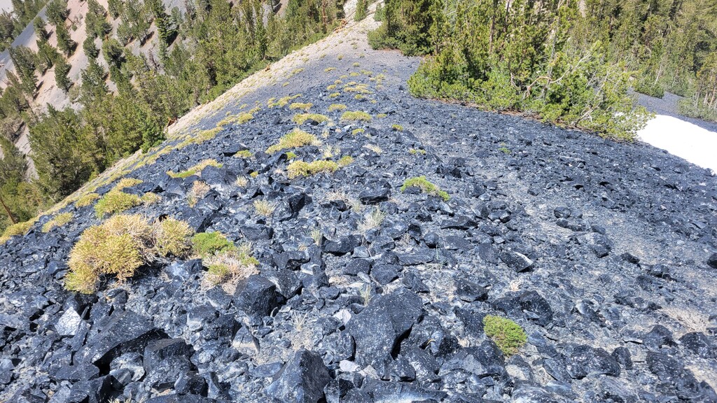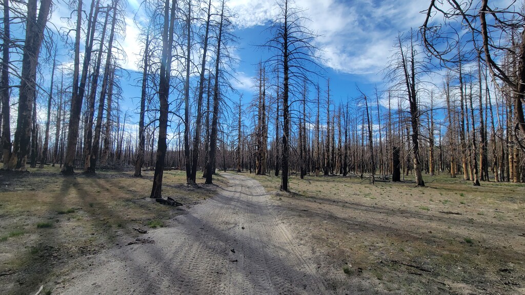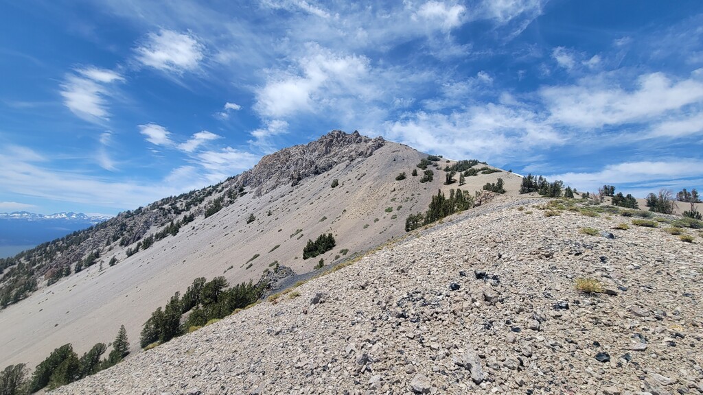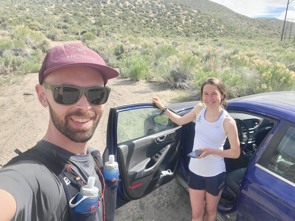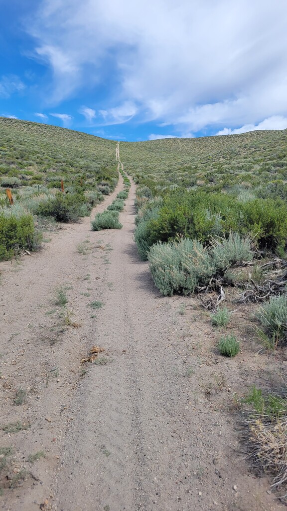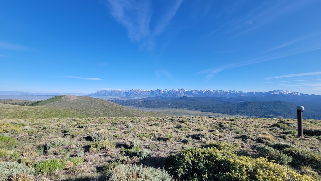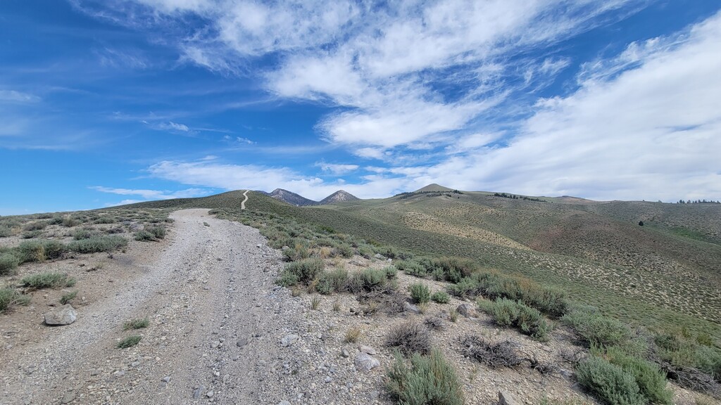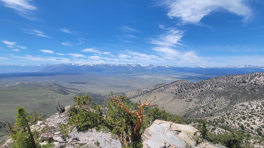 The initial climb up from Watterson Troughs was a real treat. Partially runnable at a nice grade, fairly solid footing, and great views right from the start. The road peters out between Cone and Wilfred, at which point the real fun began. The off-trail connection from there to Crooked Meadows was generally loose and gravely/sandy, often quite steep, and pleasantly open – running was generally possible for modest uphill and all downhill grades. This section had the real killer scenery, too: as advertised, unobstructed views of the Sierras, Whites, Crowley Lake, Mono Lake, and more. As the linkup goes on, you trade scenery for speed, and the first several steep peaks give way to more rolling loose terrain. Eventually I reached solid footing again on forest roads for the last ~10 miles, by which time some fatigue had set in. Sure, the last bit is a slog, but I thought the rolling meadows and ghostly burn zones were scenic in their own way, and you can really make up time on the packed surface. Overall, great route, great weather, great day. The views were killer, the terrain was interesting but not technical, and the solitude was serene. Thanks to Emma for the support, and to Jessica and Eli for the beta on this cool linkup!