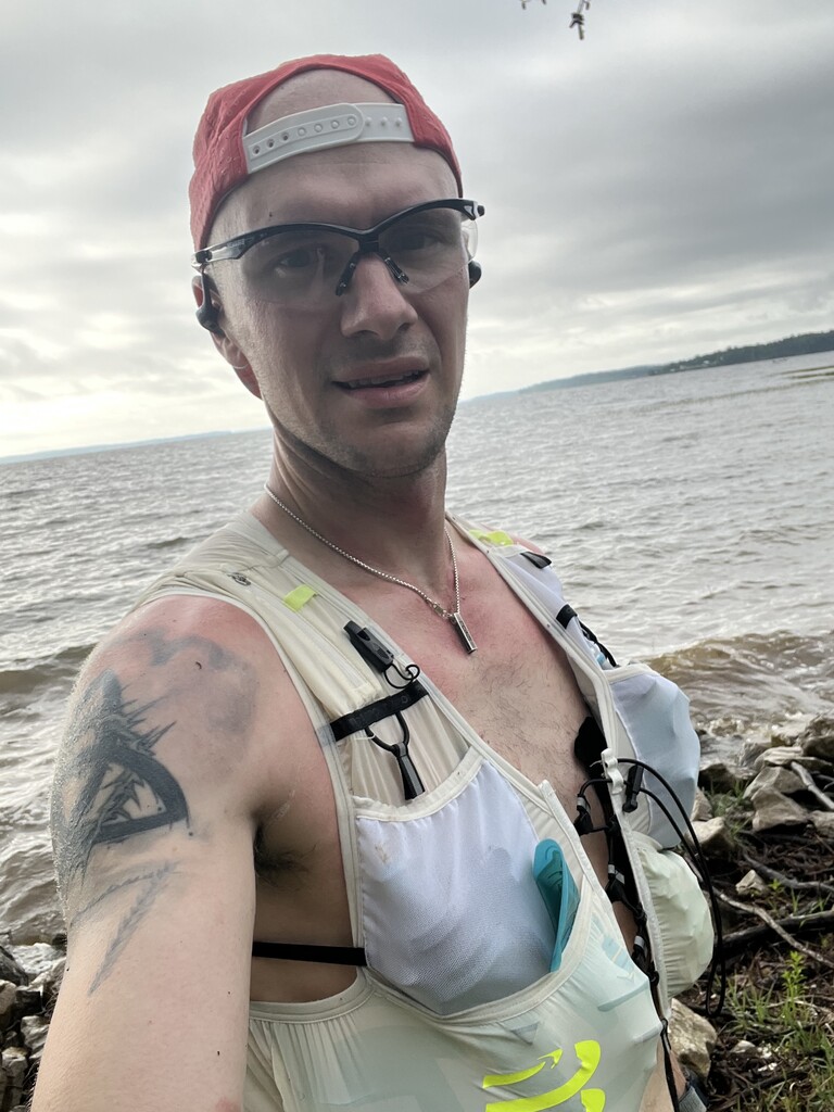 Out and Back on the Trail Between the Lakes from West to East and back. I placed three water drops the night before at 8 miles in, 16, and at the turn around. No one ran with me or met me at any time during the run. started at 3:41am. It was pouring rain at the beginning! Trail was fairly difficult to follow with the water but got easier in the daylight. Made it to the halfway point in 4:57:43. Fell a couple times on the muddy trail. Slowed down considerably with the heat of the day. Missed my nutrition drop at Yellowpine and suffered the last 16 miles! I believe the time can be greatly reduced on a supported attempt in cool weather.