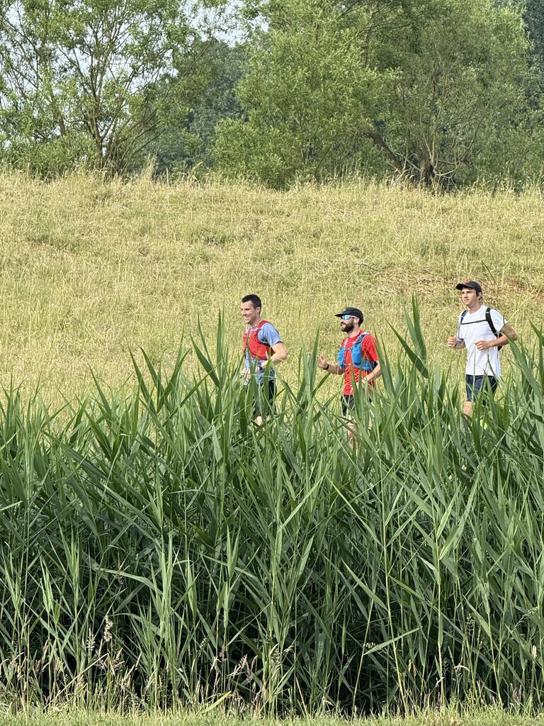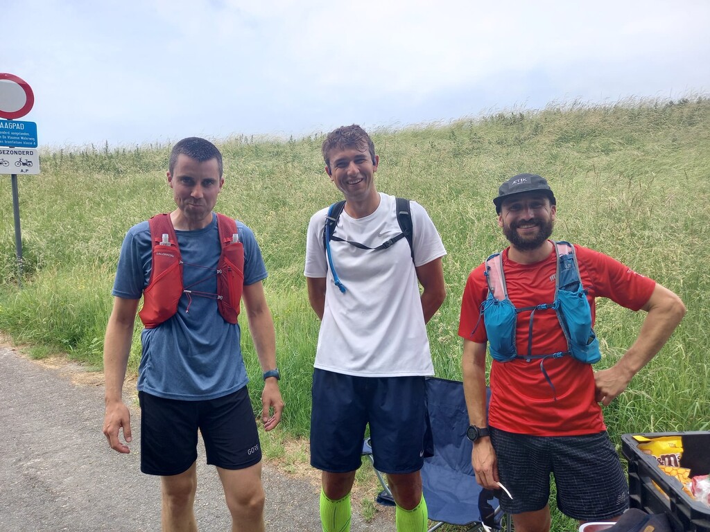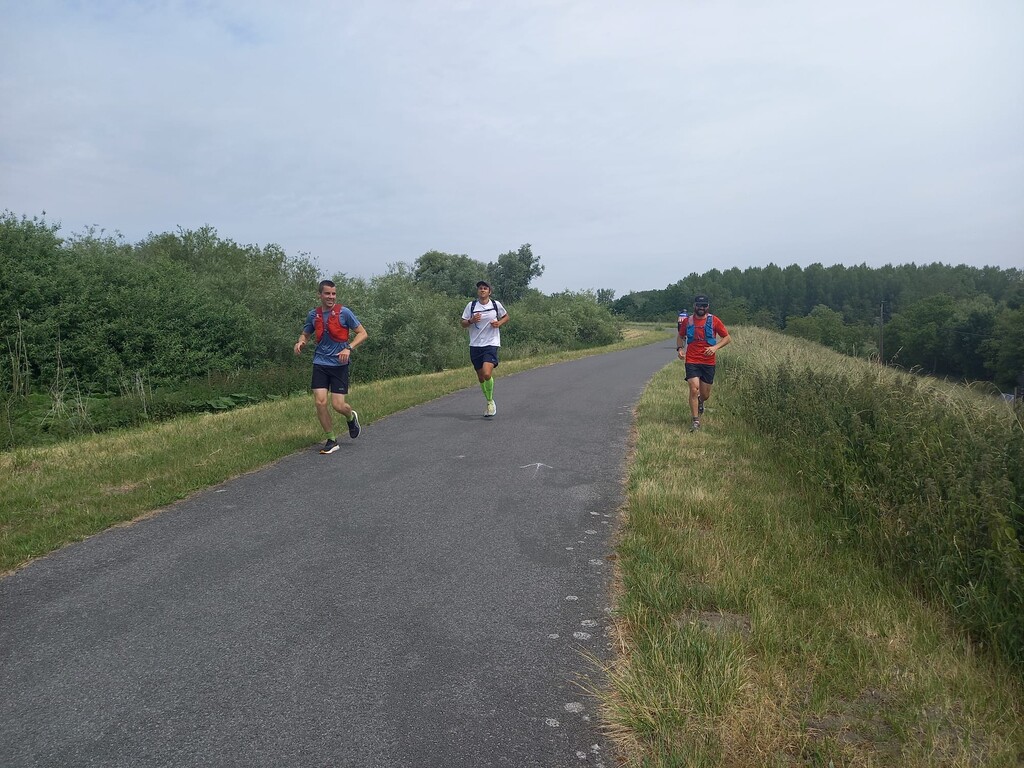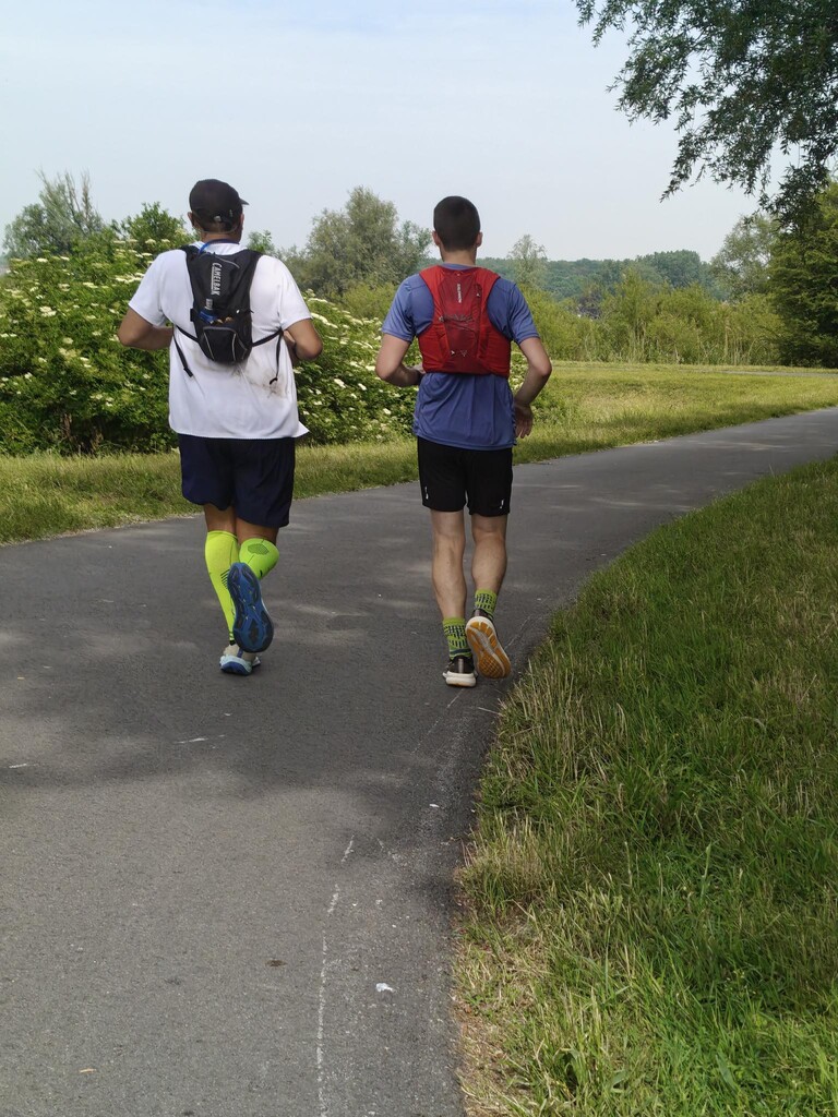 Vandaag loop ik mijn eerste ultra marathon, wat heb ik hiernaar uitgekeken. Ik sprak af met enkele sportieve vrienden (Arne met de gele sokken & Kasper met de baard), we vertrokken bij mij thuis om 8 Hr. Het parcours ligt op +/- 600 m van mijn voordeur, ideaal om fris aan de start te staan. We liepen recht naar de Schelde en dan naar links, klaar voor een tocht van 55 km. De sfeer zat er goed in.