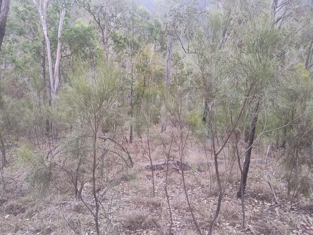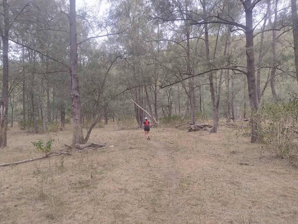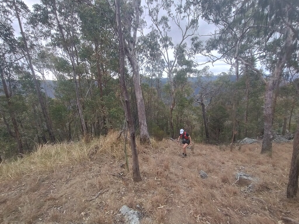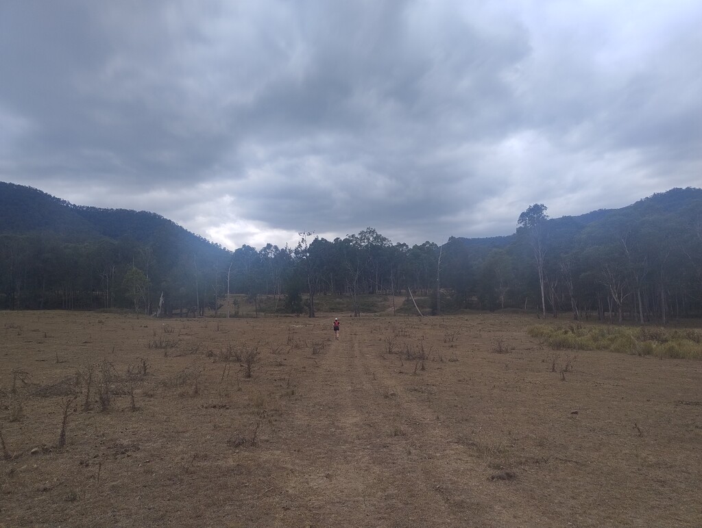 Eventually, Jordan’s Trail tipped sharply downhill. The descent became very steep, loose, and dry — steep enough that running wasn’t worth the risk, so we walked down some section. Toward the bottom, the country opened out into grassy flats as we reached the Guy Fawkes River.
