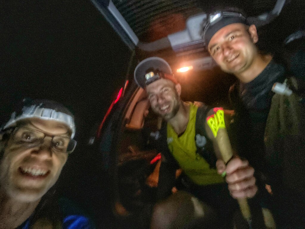We met Kat at the Dater Mountain viewpoint, carefully made our way down, and regrouped at Aid Station 3. Here we had a major transition: Chad Smith, Brian Mott, and Sam Lebowitz finished their runs. Dave Morganite joined Christian Mena, Wayne Bianchetta, Brian Kingsbury, and me for the second half of the course.
