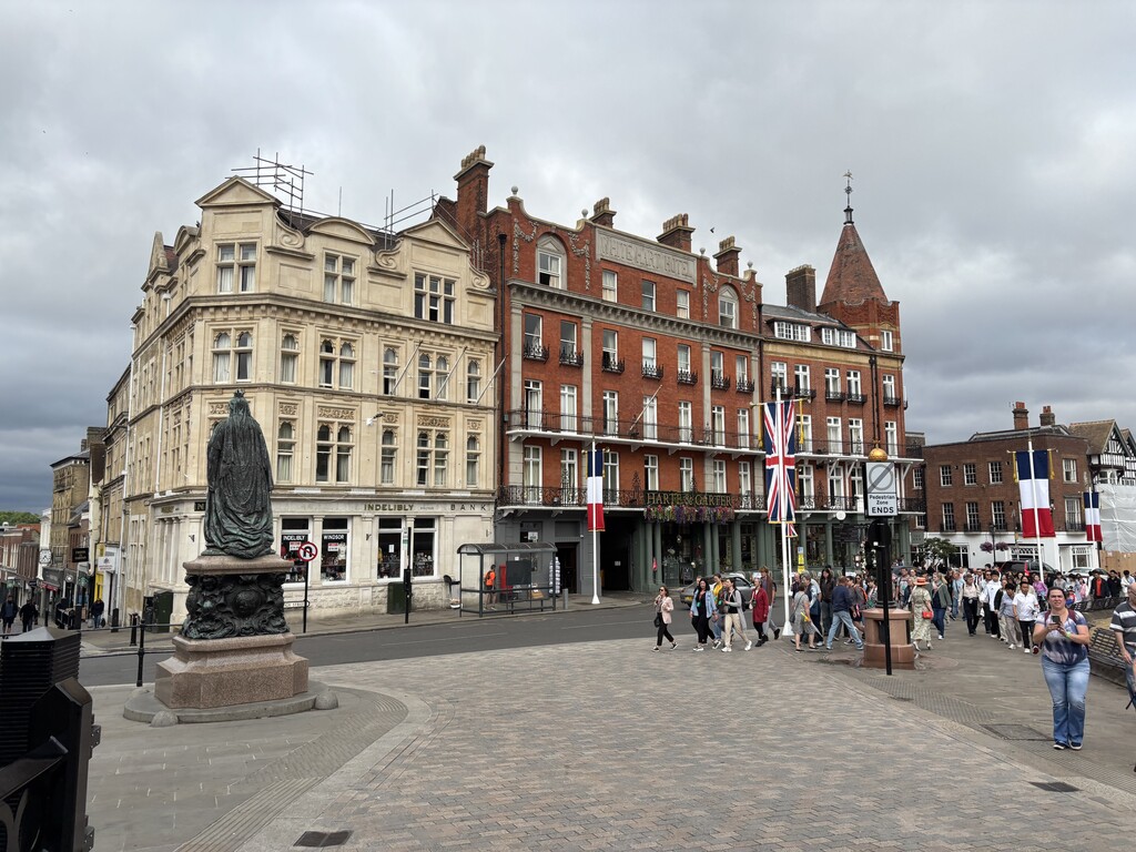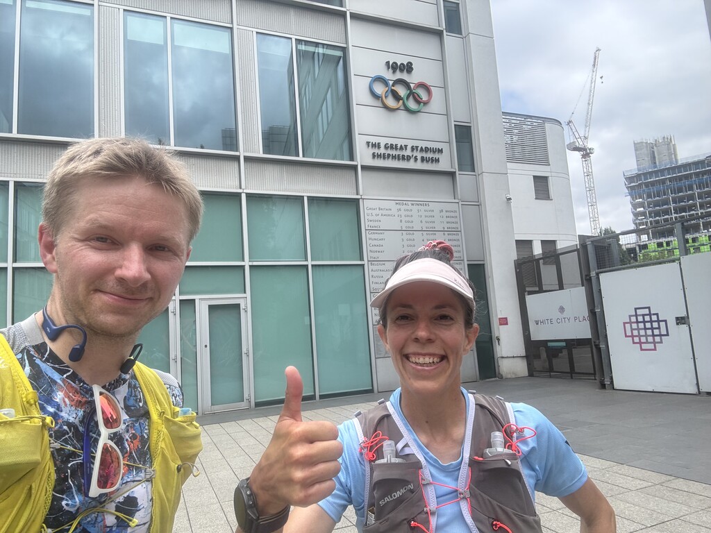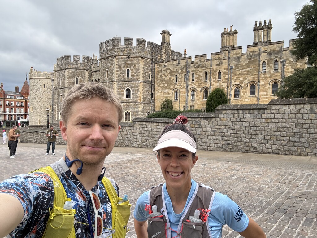 Kristina and I met up in Windsor on Sunday morning and set off from the gates of the castle at 9am - just in time before the rapidly growing crowds of tourists took over the town (which was flagged out in French as well as British flags ahead of the state visit). Julien’s description already covers the route in great detail - suffice to say that the first couple of miles (through Windsor and Eton) are the most picturesque, but at least you get the least pleasant part (along the dual carriageway between Slough and Uxbridge - with a couple of miles without pavement) out of the way early on. The route remains surprisingly undulating even through the long string of outer London suburbs. The mid-run selfie shows us at Harrow, the highest point of the route, from where it is mostly downhill - although the stretch through Wembley still goes on and on.