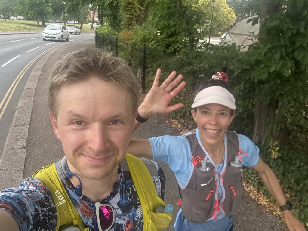 We ran unsupported, both carrying running vests (with a total of 3l of liquids plus nutrition). The weather was muggy and humid (the promised showers didn’t materialise) but at least we had cloud cover for most of it.