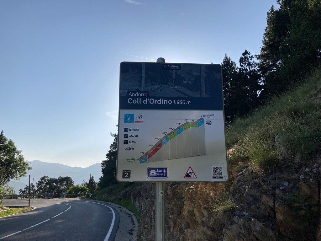 The route ends at the foot of the last peak, also an iconic cycling location - the Coll d'Ordino, where there is a small parking lot. Once again there isn't regular public transit; taxi flat rates are 28 Euros from here.