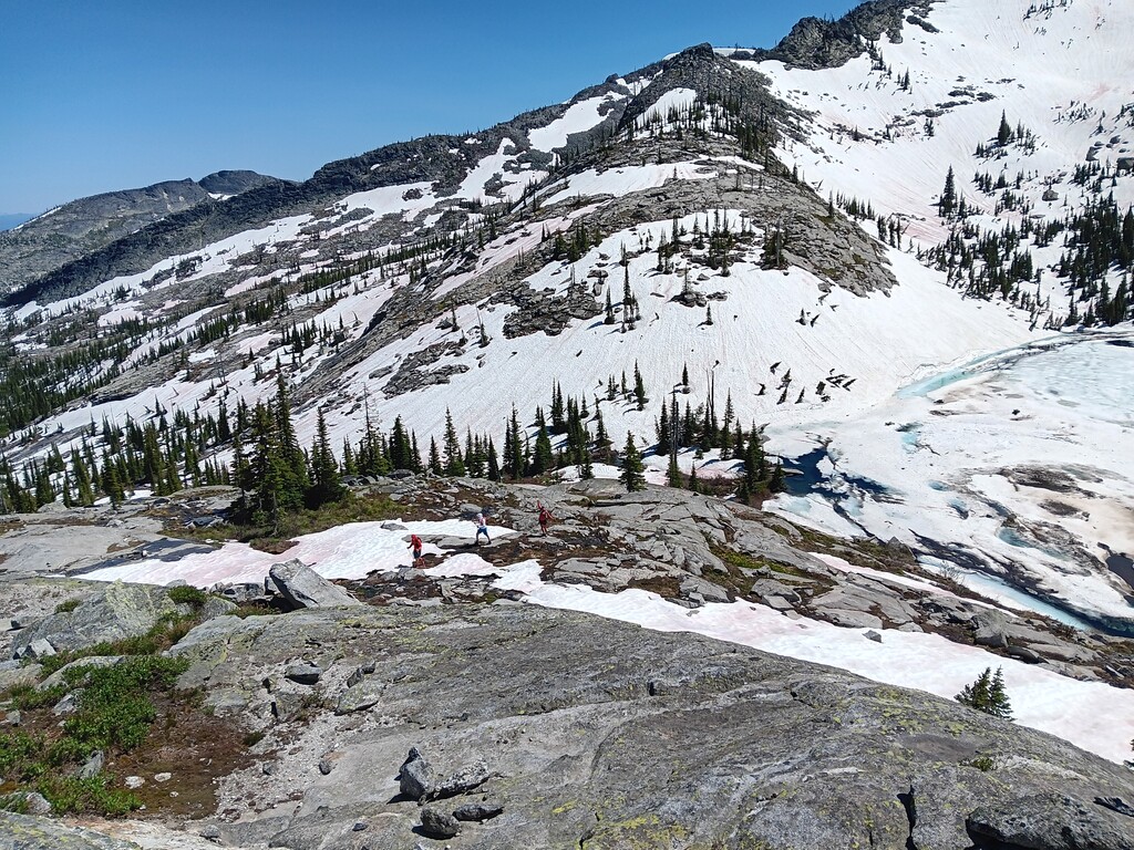 The path down to Hunt lake was completely snowed in still but the snow surface was perfect for hiking and glissading. The bushwack around the lake sucked; we took the east side. Maybe the west side is better?? Boatman nicely waited until the end of the day to gloat how his compression socks had saved his shins from all the scratches the rest of us had. There were 4 dudes camped at Hunt lake: they were a little stupified at where we had come from and that all of us went swimming (there was still ice on the far end of the lake). The trail out of there was slow on shot quads through the boulder fields, but soon enough we were at the trailhead. Met the sag-wagon where the road became drivable again by a mini van for some water. Then crushed the last 5 miles down with 2 short bushwacks to cut mileage. Celebration and creek dunking at the the East Shore Road!