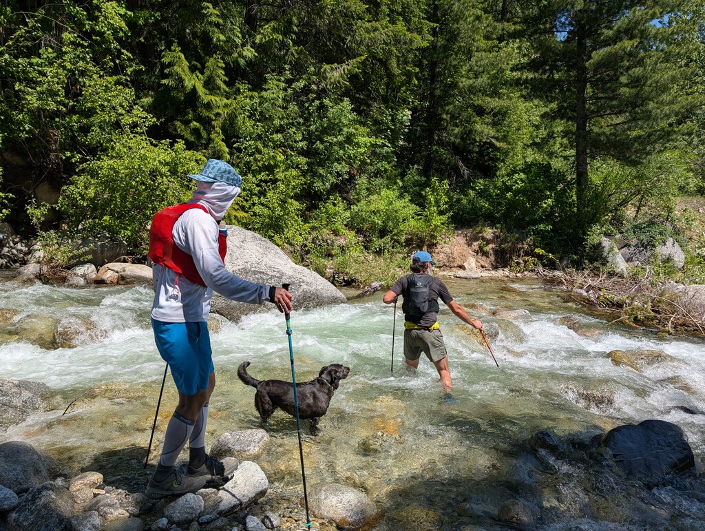 We had a good warm up on the ~2.5 miles of pavement before we dove directly into our first bushwack up State land towards Dodge Peak. I decided to deviate from the previous two reports and skip White Peak straight for Dodge. I've hunted up the logging roads there and knew it would be pretty doable. Logging road, bushwack, logging road, bushwack was the sequence for the first quarter. Hit the false summit of Dodge then picked up the 4-wheel trail to cruise down to the Pack River drainage. Snacks and cold drinks in the shade at our Pack River crew stop.