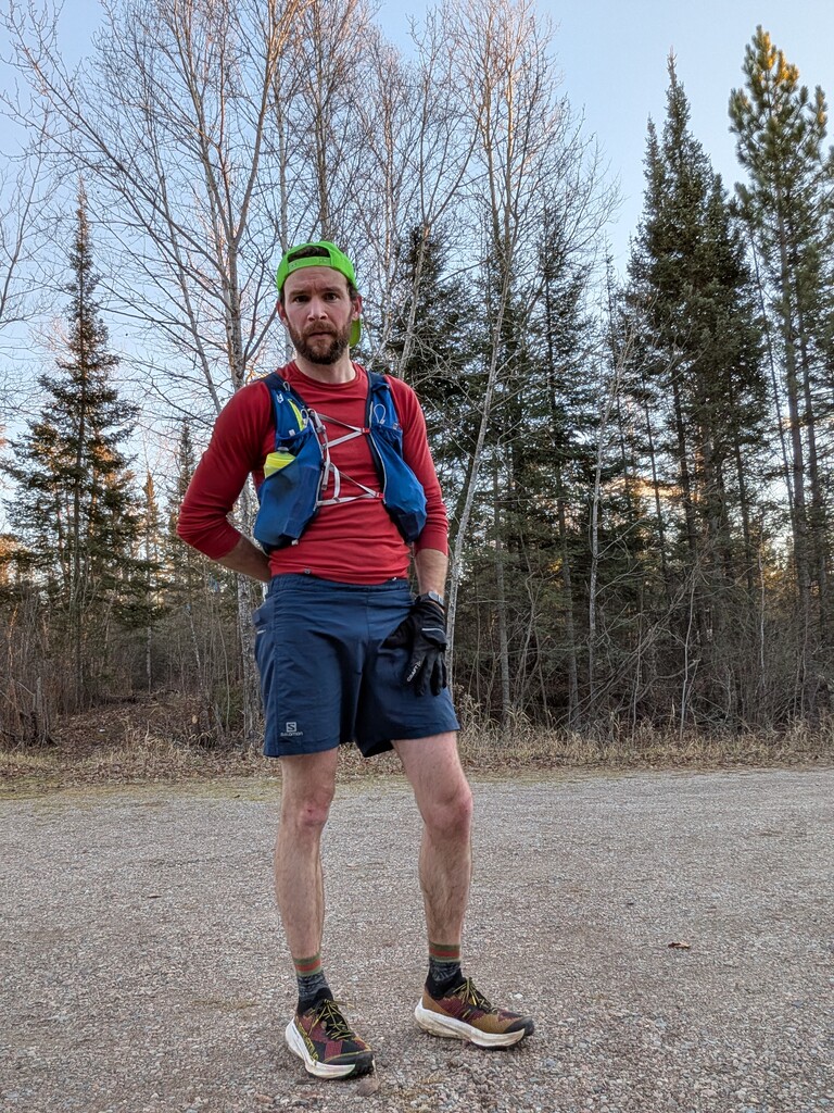 I'm always packing for these runs as if I have to self-rescue after a sprain or break. Given the short daylength, I packed for the possibility I could be out past dark and stuck in cold temps. My running vest held long underwear and track pants as well as a long-sleeve quarter zip and hooded windbreaker, two lighters for firestarting, and two headlamps as well as an emergency bivy and Zoleo satellite communicator. I ran in shorts, a wool long-sleeve shirt, and gloves.