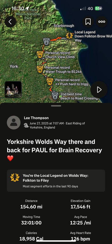 we completed the run to raise funds for the charity PAUL for Brain Recovery. We had an amazing support crew of Josh Hornby, Phil Andrews, Leigh North and our partners Kayleigh Sullivan and Gemma Clement. They met us at various points along the route to help us resupply food and nutrition.