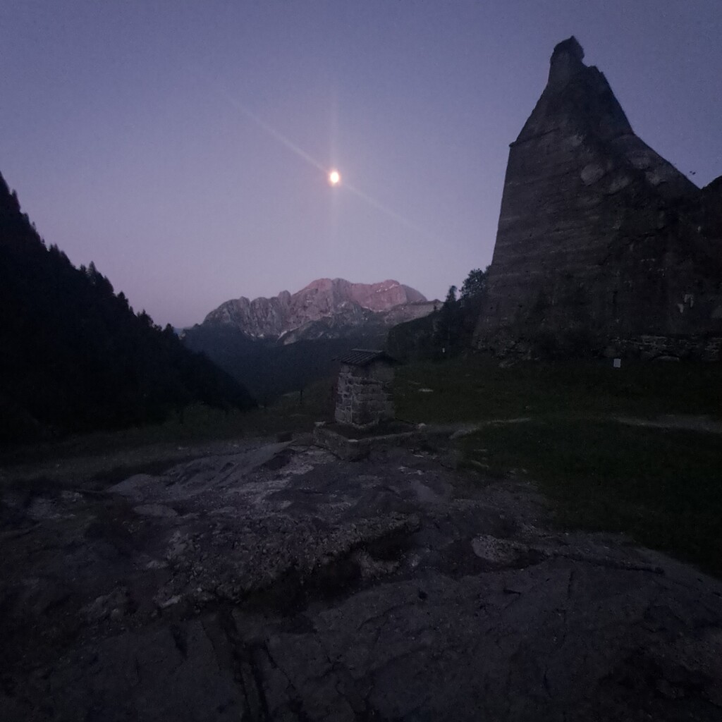 Con l'amico @carlo.picchi partiamo alle 00.00 dalla chiesetta commemorativa di Darfo boario Terme, l'obbiettivo è impegnativo, percorrere tutti i 95km della famosa @laviadecia, il cammino dei boschi di ferro, lo vogliamo fare nel nostro stile fastandlight, una sola tirata per tutte e 5 le tappe del cammino.