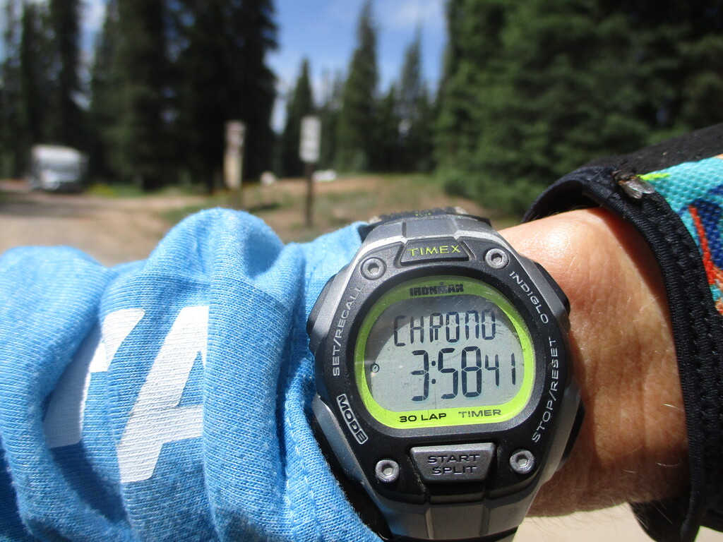 I tried to push the pace on the uphills, while still being careful on some of the slicker downhills. John had no trouble keeping up in either case. He suggested we could beat 2.5 hours to the turn-around and we just made it. Then he thought we could break 4 hours total, so we ran for it and also just made it.