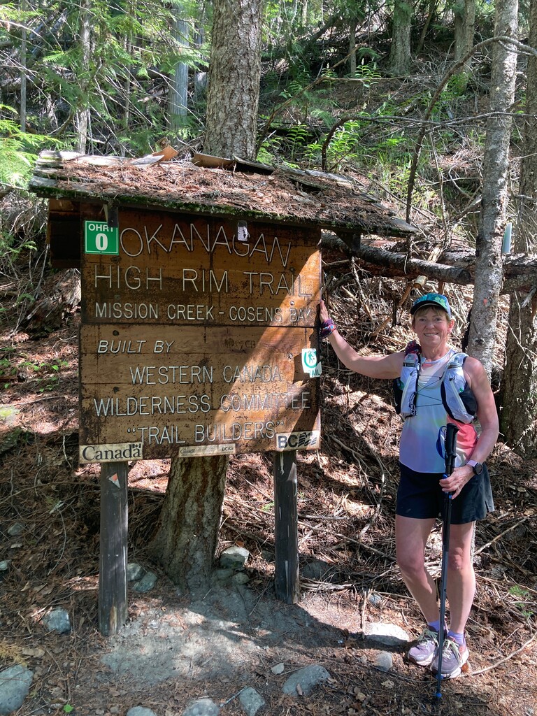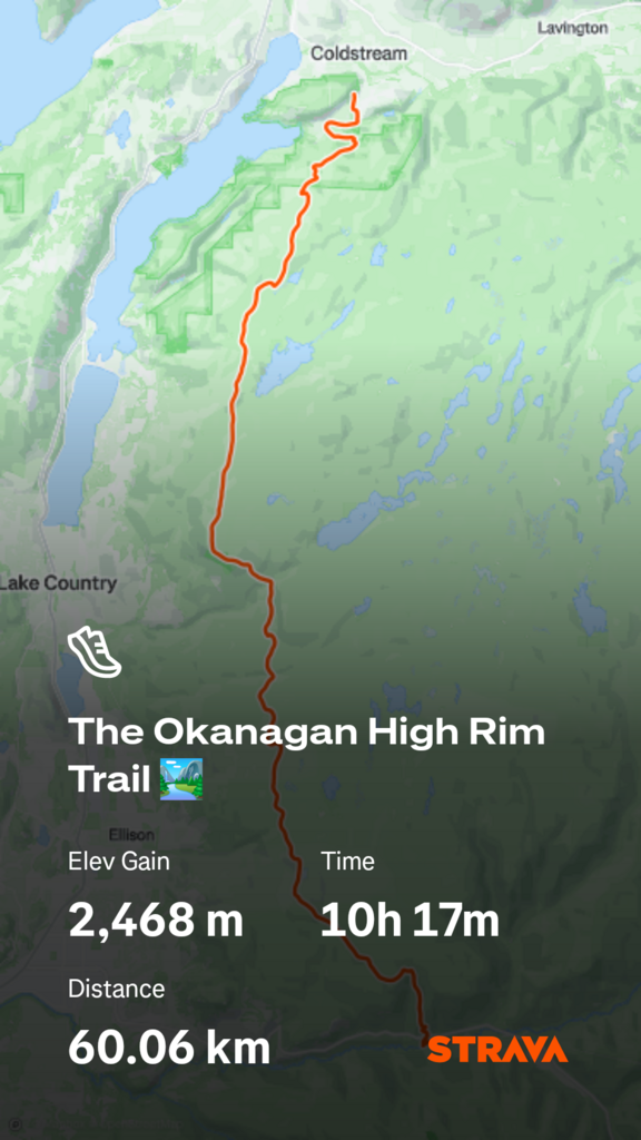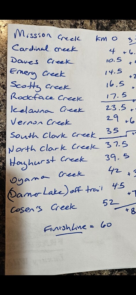 Joined by ultra-runner Steve Korchinos from Okanagan Falls, who had also been wanting to check this one off his bucket list, we did a cardrop at the north end at Cosen's Bay OHRT trailhead early in the morning, and drove down to Philpott Rd/Hwy 33 to leave the second vehicle. From here, we ran a short distance to Mission Creek which is KM O to begin our run northbound. We started our watches at 9:44 am... finishing up at Cosens Bay Rd's OHRT trailhead 10 hrs and 17 mins later.
