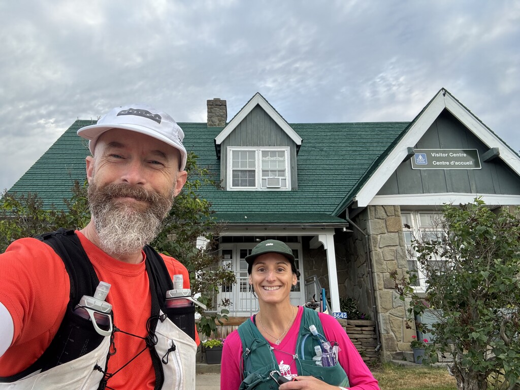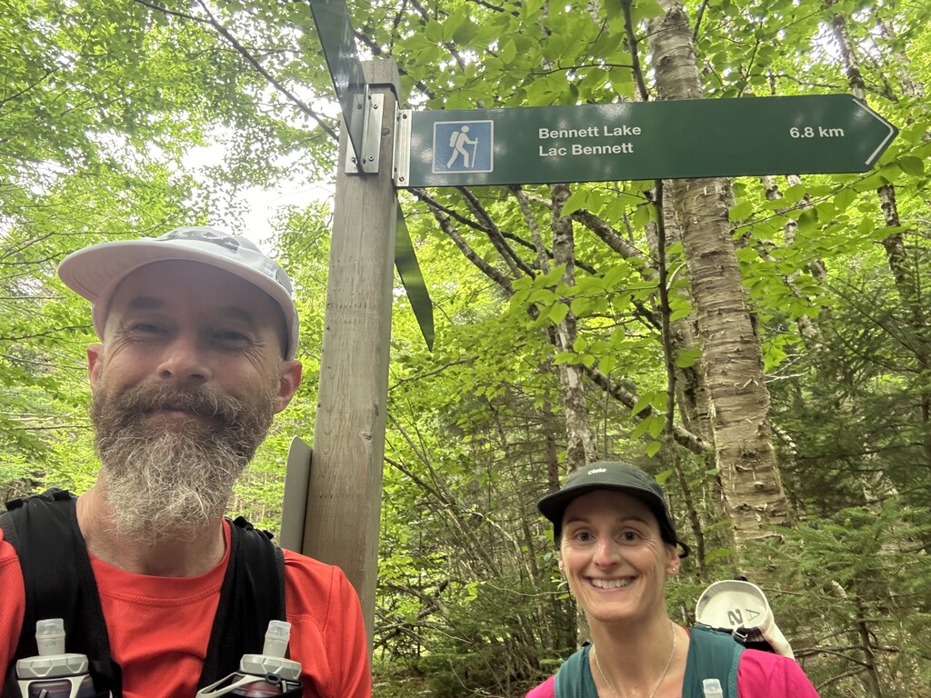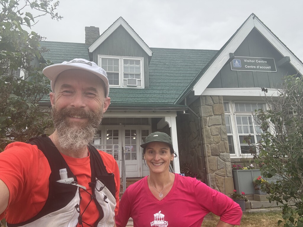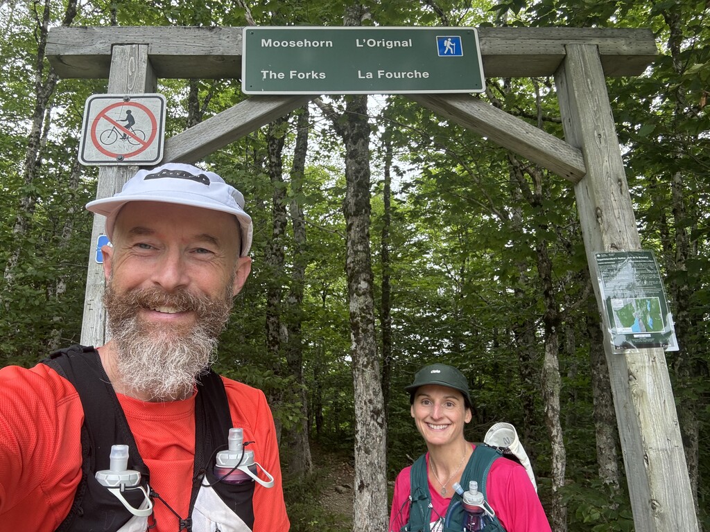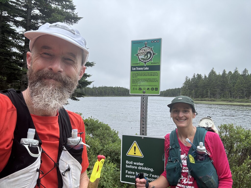 On July 20th, 2025 Nicole Leger and I (Mark Hemmings) attempted the Mixed Gender Team FKT for the Fundy Circuit. The Fundy Circuit can be described as a loop that almost tracks with the outer perimeter of Fundy National Park, in New Brunswick, Canada. Our attempt was run clockwise, starting and ending at the Headquarters building. We started our run at 6:38am to hopefully end the run prior to the afternoon rain showers that were forecasted. It was a mostly overcast day and about 14 to 19 degrees celsius, and very humid. The water was really low so it was possible to stay dry at all river and stream crossings by skipping on rocks and boulders. We always had enough streams and creeks however to fill up two 500ml Salomon XA filtered flasks. We packed 8 hours worth of nutrition in our vests. Highlights were a very large moose that ran past us on the trail, seeing unexpected friends hiking on the trail, and a cool headwind on the last 1/3 of the trail coming from the Bay of Fundy. The actual distance of the Circuit is hard to assess, as Fundy National Park says that it is 50km, however our Apple Watch, Garmin Fenix’s and Garmin inReach all stated a few km’s shorter. Most likely Fundy Park counts some non-Circuit side trails such as Marven Lake which may up the km’s to 50. Our GPX file from Apple Watch states 48.31km but one of our Garmin devices was as low as just under 47km.