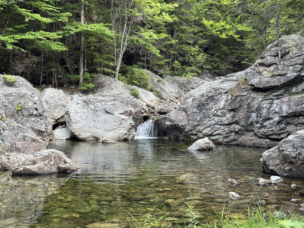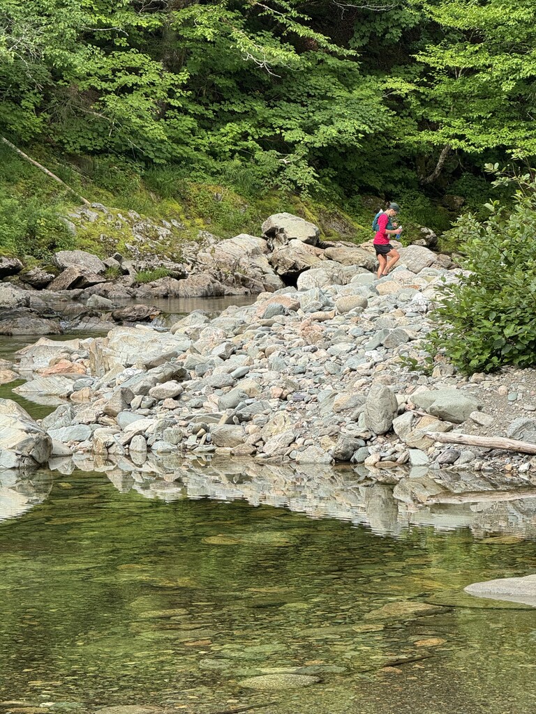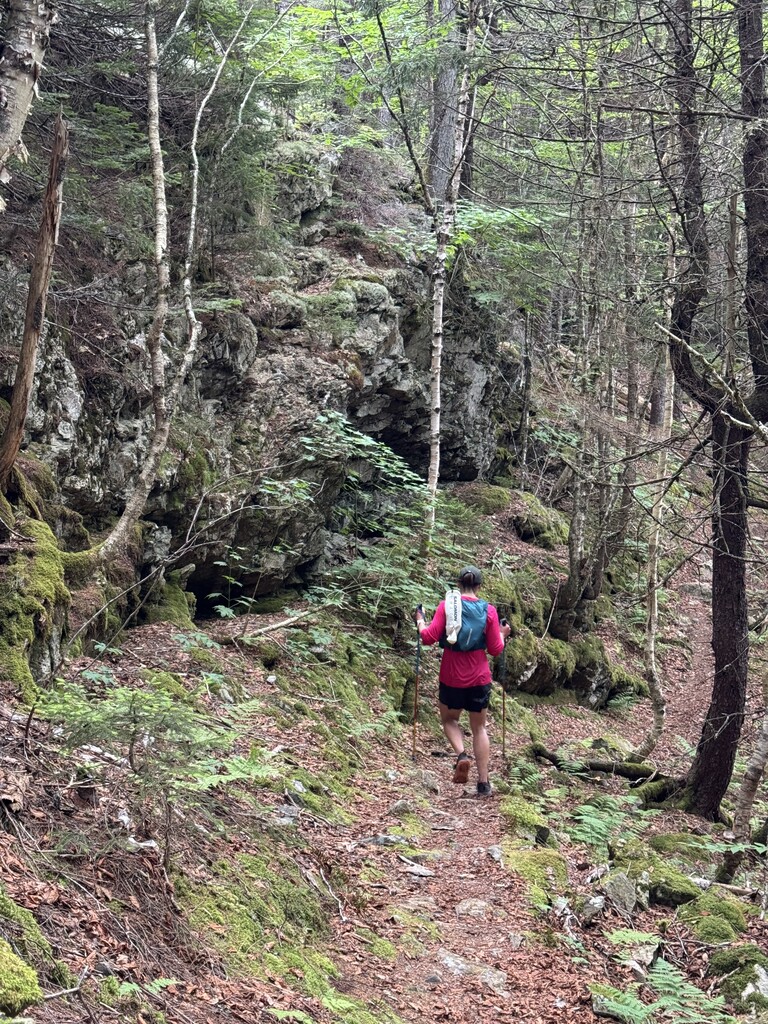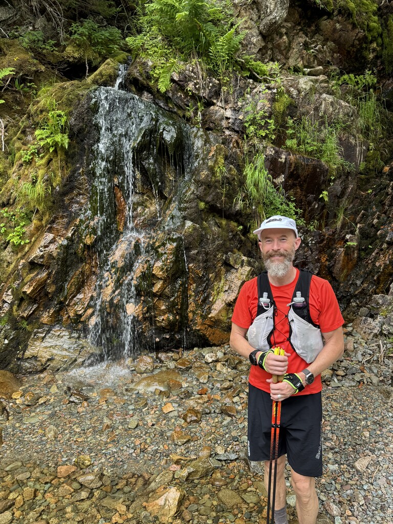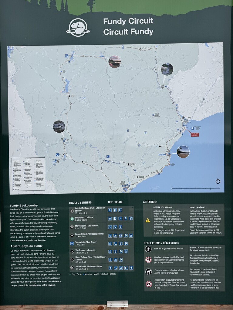 On July 20th, 2025 Nicole Leger and I (Mark Hemmings) attempted the Mixed Gender Team FKT for the Fundy Circuit. The Fundy Circuit can be described as a loop that almost tracks with the outer perimeter of Fundy National Park, in New Brunswick, Canada. Our attempt was run clockwise, starting and ending at the Headquarters building. We started our run at 6:38am to hopefully end the run prior to the afternoon rain showers that were forecasted. It was a mostly overcast day and about 14 to 19 degrees celsius, and very humid. The water was really low so it was possible to stay dry at all river and stream crossings by skipping on rocks and boulders. We always had enough streams and creeks however to fill up two 500ml Salomon XA filtered flasks. We packed 8 hours worth of nutrition in our vests. Highlights were a very large moose that ran past us on the trail, seeing unexpected friends hiking on the trail, and a cool headwind on the last 1/3 of the trail coming from the Bay of Fundy. The actual distance of the Circuit is hard to assess, as Fundy National Park says that it is 50km, however our Apple Watch, Garmin Fenix’s and Garmin inReach all stated a few km’s shorter. Most likely Fundy Park counts some non-Circuit side trails such as Marven Lake which may up the km’s to 50. Our GPX file from Apple Watch states 48.31km but one of our Garmin devices was as low as just under 47km.