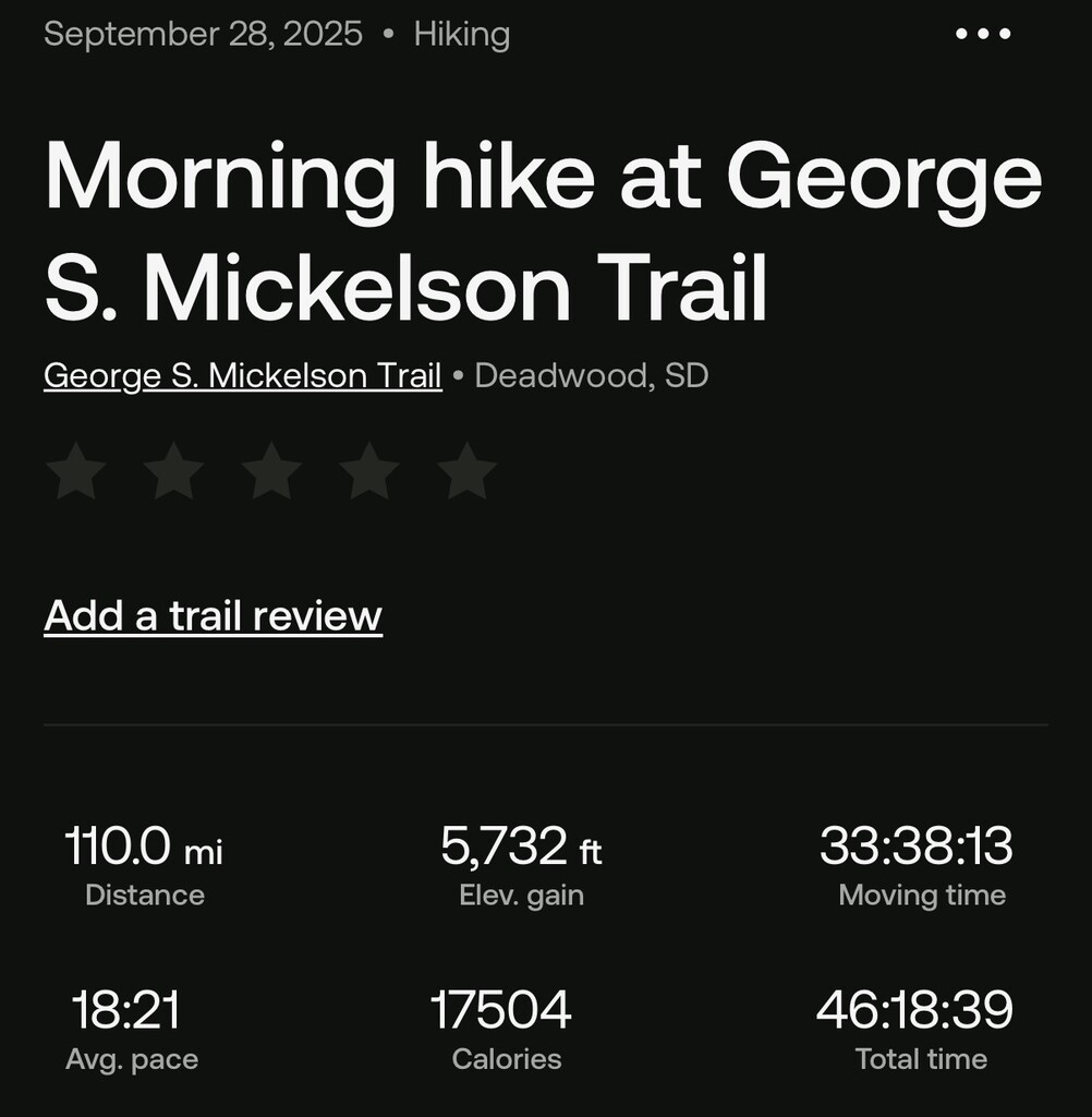 Started in Deadwood, did about 48/49 miles the first day. Stealthed in Hill City.