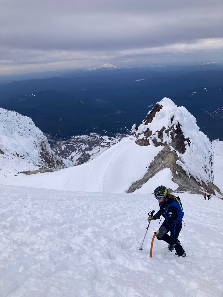 This FKT is listed as supported because as Jackson Cole was going back down, he passed off his ice axe to me and traded me for my pole. Jackson had started about 20 minutes before I had, and I didn't see him at all on the way up until he was on his way down the snowfield below the Old Chute. When I saw him, he told me that the Chute was pretty steep and I would want a second ice axe to be able to move quickly and safely through. So I ended up swapping my pole for his ice axe for safety reasons, that way I could double ice axe up and down the steep section of the Chute. Other than that instance, it was a solo effort. Shoutout Jackson for being a chiller, taking some great pics as we crossed paths, and helping me believe I could go for this beforehand.