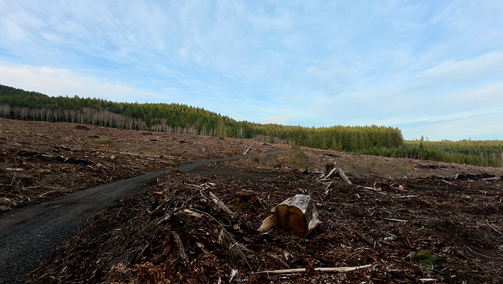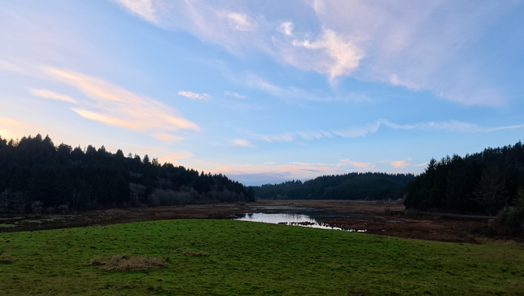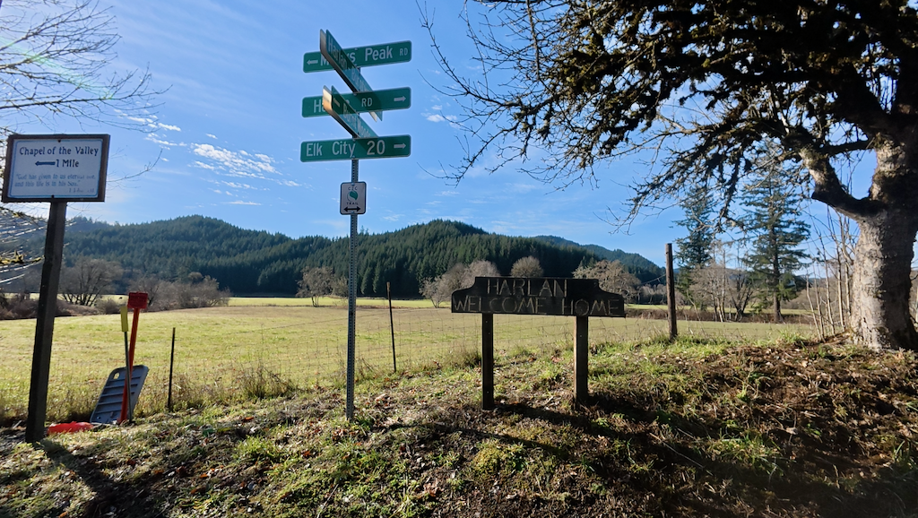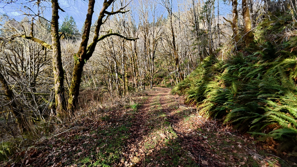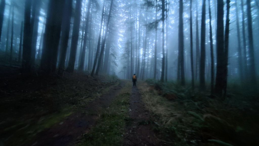 Once corrected, we settled onto the paved path toward Philomath. The morning was clear and cold, with astonishing stars and the Big Dipper bright overhead. Eerie blue streetlights cast a vaguely dystopian glow over apartment complexes. Landmarks passed in sequence: the McDonald’s (closed), the edge of town, and finally the turn toward the forest.