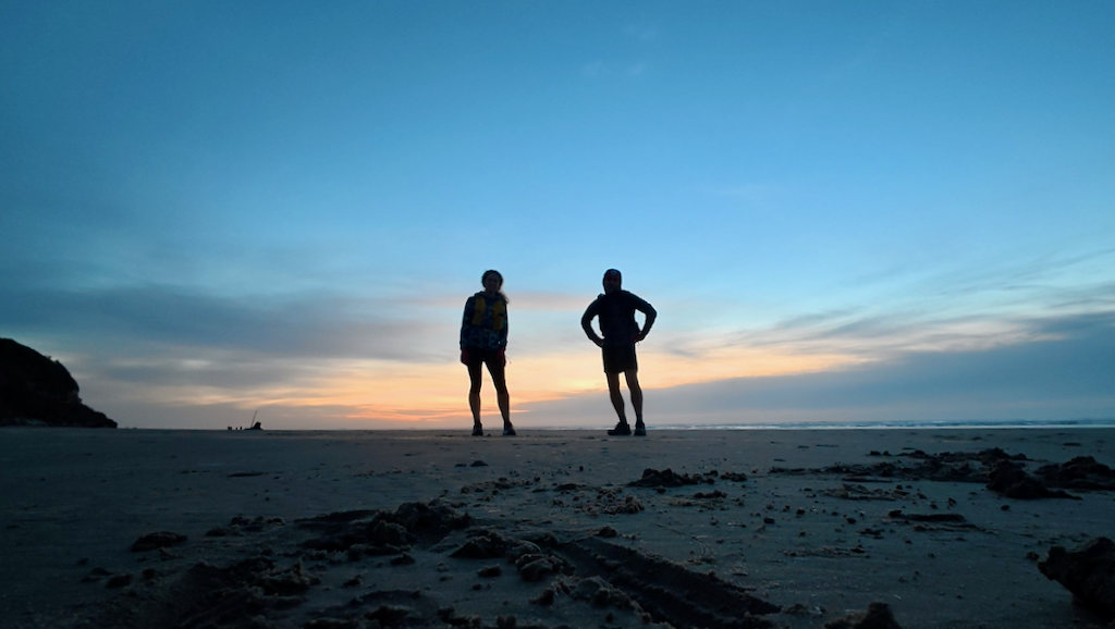 After just over three hours in, we paused for sunrise and bagel number one (of approximately seventeen). Spirits were good. We continued into terrain that briefly resembled an actual trail: lush forest, ferns, and trees doing what trees do.