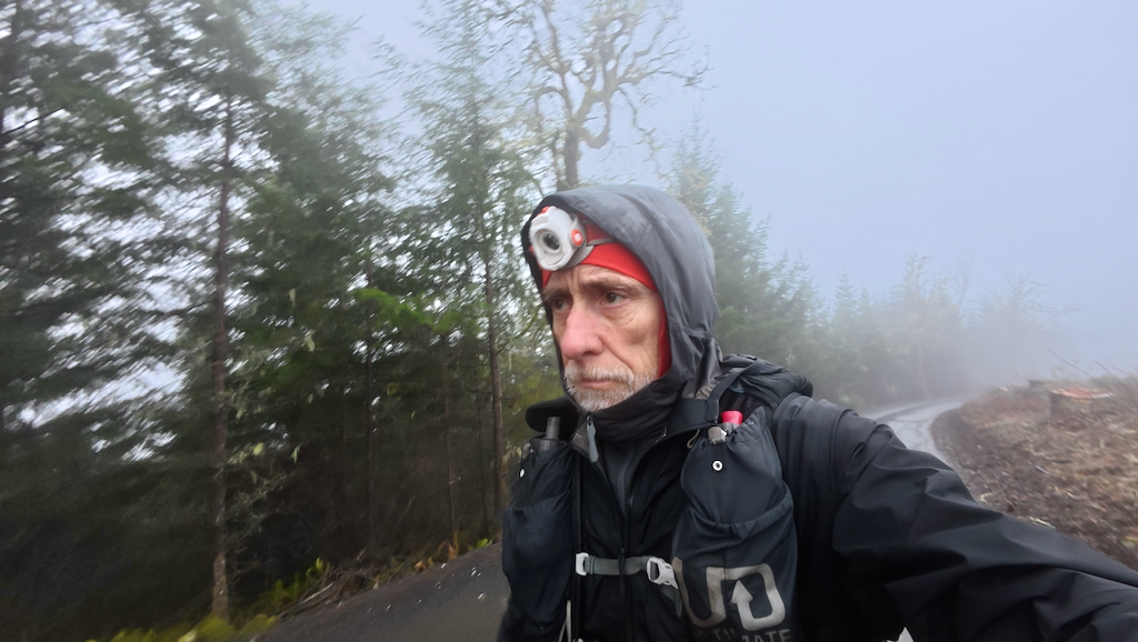 By the time we were climbing again toward Marys Peak, it was pouring. Rain pants and jackets soaked through in minutes. Cold set in. Fog thickened to the point of near-total visibility loss. Dawn crept in without encouragement.
