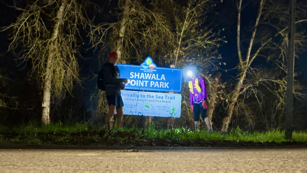 We started under the freeway in downtown Corvallis, exactly as advertised. The moon was nearly full, stars were out, and the hour was indecent. The Corvallis-to-Sea (C2C) trail (not so much a trail as a loosely affiliated route) began quietly enough. We hoped for luck.