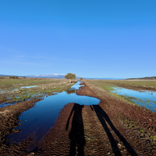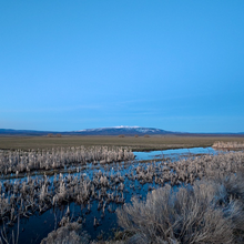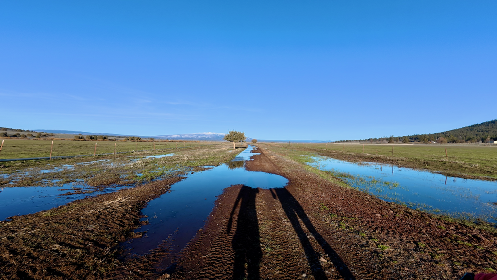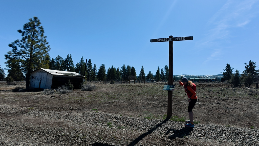 We passed through the Sprague River area again, crossing the weathered railroad sign. The sunny, warm conditions that had seemed pleasant the day before now felt oppressive. Our water supplies were running low, and though there was plenty of water visible along the trail, it was mostly agricultural runoff and unsafe to drink.