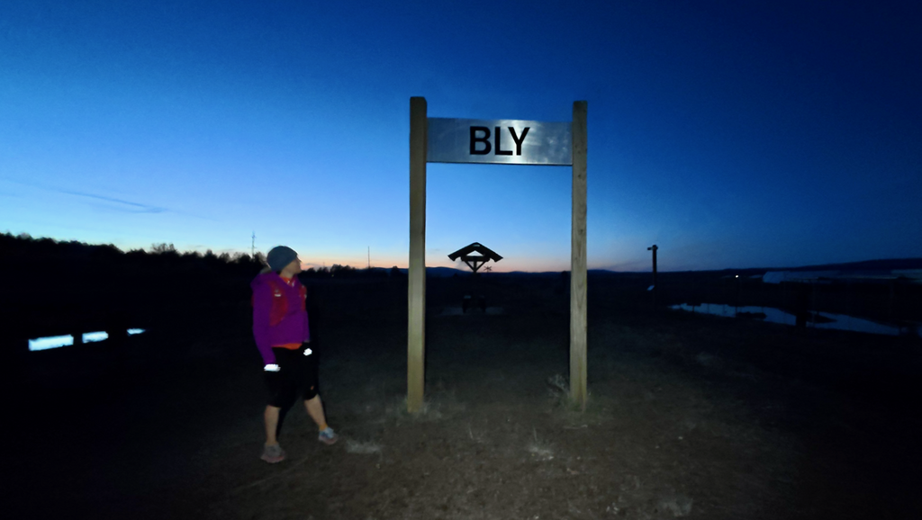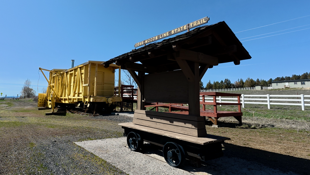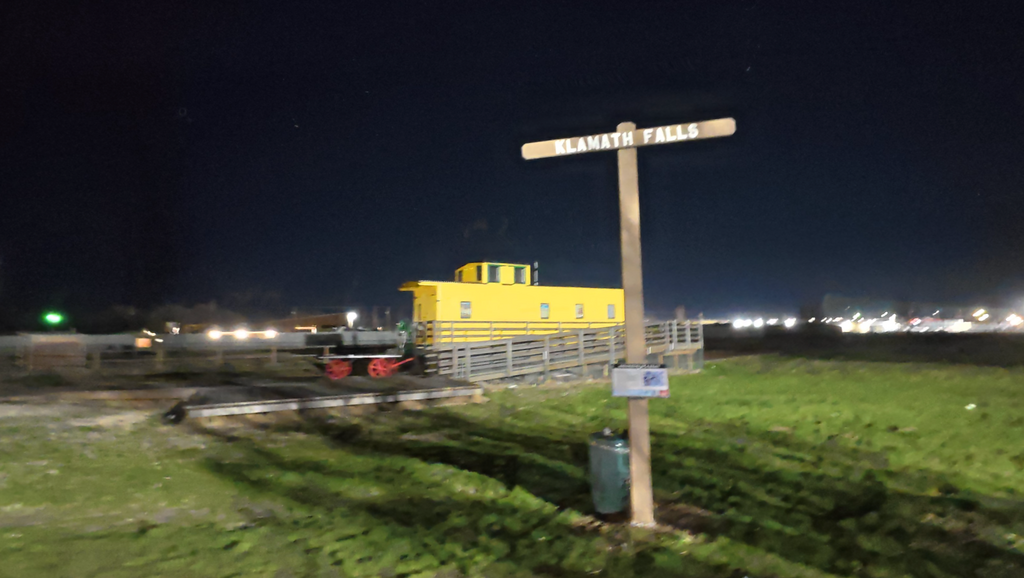 We stood beneath the “KLAMATH FALLS” sign at the western terminus of the OC&E Trail at 4:07 AM on Friday, April 4, 2025. The yellow caboose stood silent witness to our ambitious undertaking in the pre-dawn darkness. With headlamps illuminating our path and breath visible in the cold morning air, we started our watches and began our journey eastward.