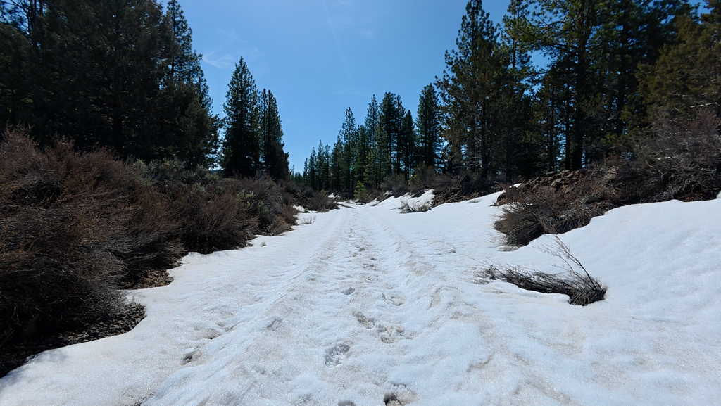 Dawn of our second day found us approaching the highest elevation point of the route—Bly Mountain. Here, the trail climbs over the mountain via a double switchback, originally built as a temporary solution when funds ran short for a planned tunnel. To our dismay, this section was covered in several inches of snow, slowing our progress significantly.