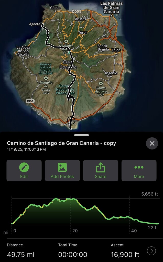 “Gran Canaria didn’t disappoint. Where else can you find mountains dipping into the ocean, Sedona and Gran Canyon, and Machu Picchu-like scenes all wrapped into one? 55 miles and 12,000 ft of gain across eroded volcanos where the north is lush and the south feels like southwest US. From tropical plants to short grass prairie and Canary Island pine groves. What a gem.