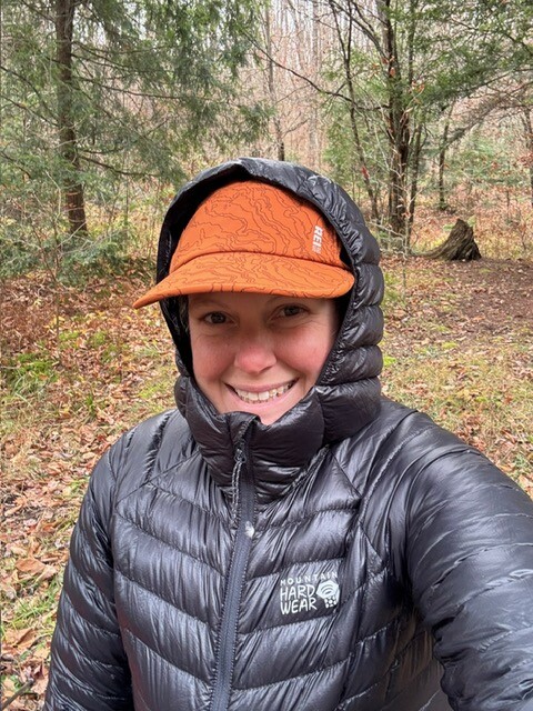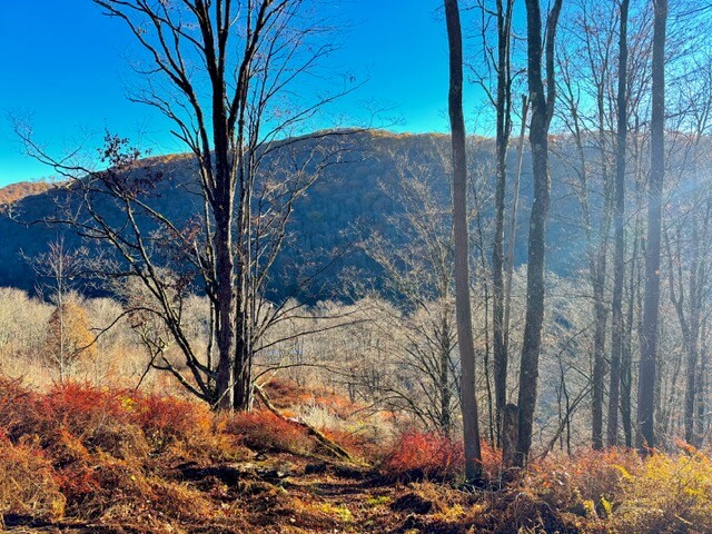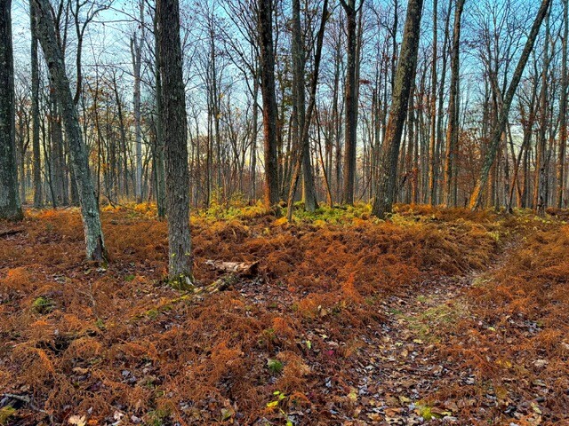 I had woken up a few times in the night to the wind picking up outside my dyneema walls. It didn't seem like a concern, and I did a pretty good sweep for widow makers before setting up where I did. I had my alarm set for 0545 to maximize daylight hiking time. I woke up then but was too cozy and didn't start packing until light started appearing. I was on trail though not too long after I wanted to be. It was still a hair before sunrise, 0634. I finished the ridge walk with the wind from the night continuing on through the day. The drop down to the W Branch Road was the typical East coast hiking I so remember. Halfway down I saw a sign saying this was Cardiac Climb. This led to a nice internal debate while I scrabbled and slipped down the rocks and wet leaves as to whether I'd rather have a steep up and switch back down or vice versa. Jury's still out on which is better for me, but I will say the best is when both are a nice grade. It was very cold down in the valley and across W Branch Road. I was glad to have camped on the ridge. Frost glistened on the grass and leaves around me. Climbing back up to the next ridge was a relief from the cold. The rest of the morning wasn't overly memorable, but still enjoyable. The forest was very pretty despite being a week or two past its fall prime. Steep down then slow up eventually crossing Ridge Road and Thompson Hollow Road where I saw the first bit of human life since starting. A car was parked on the road. A short bit later I reached the spot marked as a vista. I took the short path over but was mildly disappointed to not have much of a view. Really, it was similar to what I had been seeing. I turned back and carried on up the trail. A little later, I ran into the owners of the car, Two guys out bow hunting. We exchanged pleasantries where I said I'd be hiking at least 10 more miles, though in actuality it ended up being 17 more miles from that point. I wasn't just being cagey for my safety; I hadn't actually decided where to stop for the night. Not long after, at 1111, I came across my first trail register at the standard starting location for this hike. It's completely possible there were others, but I didn't see them. I signed in as Porcupine, my trail name bestowed upon me during the PCT where I continuously had holes in my inflatable gear. Therm-a-rest eventually just gave me a new pad since I had so much tape around the valve. Carrying on, it definitely felt like it could be a busier area with more trail junctions. I didn't see anyone. It was a cold late fall day where my mittens came off for a total of 10 minutes all day, well maybe 30 if I include lunch time.