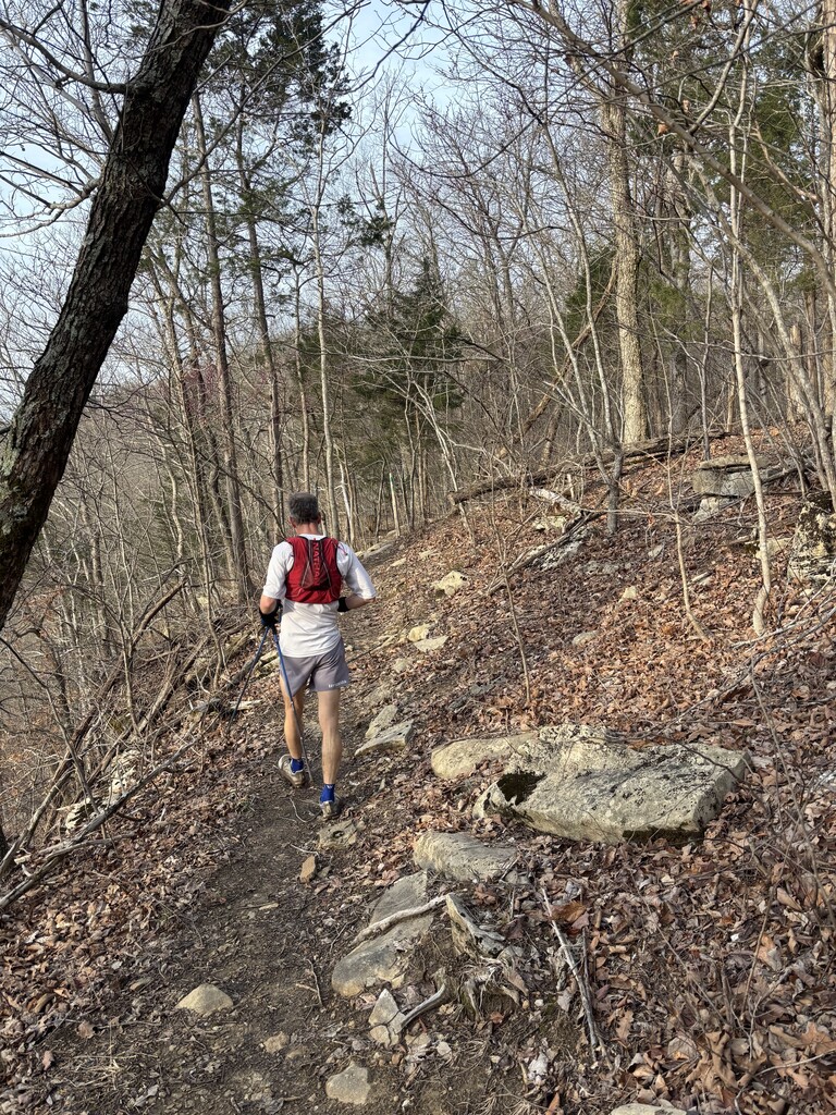 We planned for a self-supported effort and wanted to decrease how much we would have to carry . We parked one car at the lollipop stick end with supplies. We dropped water and food at the second Old Forest rd crossing. Then we drove across the park to start at Cold Friday rd. We ran clockwise. This gave us sections of around 12mi, 5mi, and 8mi between our stops. We started at 5:15am with the temperature in the mid-30s under a clear starry sky. The temperature rose to the low 60s and we had mostly sunny skies. We certainly couldn't blame the weather for anything. Somewhere between 1-2 hours, I spotted eyes reflecting our headlights in the dark. The animal was moving and actually approached us cautiously. I finally got a good look at the entire animal when my headlight illuminated its body as it crept under a tree towards us. I was surprised to see that it was a bobcat. The bobcat's curiosity seemed to fade instantly upon closer inspection of us, and it silently and gracefully disappeared. Not long after this, we crested a ridge to see a red crescent moon. It was certainly a good start to this endeavour.
