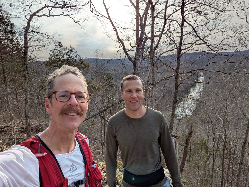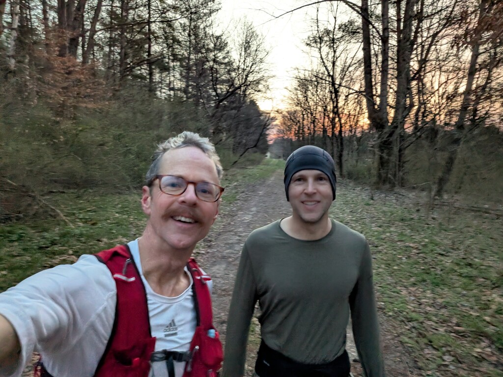 What's better than one loop of the Adventure Hiking Trail? Two loops! Maybe, maybe not. The jury might still be out on that one. I can say that the route is fantastic with great scenery. It also provides a significant challenge. This was the goal when I reached out to Nathan inquiring about getting together for a longer run sometime this winter/spring. I had been struggling with motivation while coming back from an injury. I wanted to get out and do something beyond my current fitness to challenge myself. I wasn't able to motivate myself to do this on my own. Nathan didn't hesitate and communicated his interest. Initially, I think we were both picturing a 20-30mi run together. Through some process I don't quite understand we quickly settled on attempting the FKT for two loops of the AHT.  We both did one long training run and about a month from the time we initially spoke, we were setting out together on the AHT.