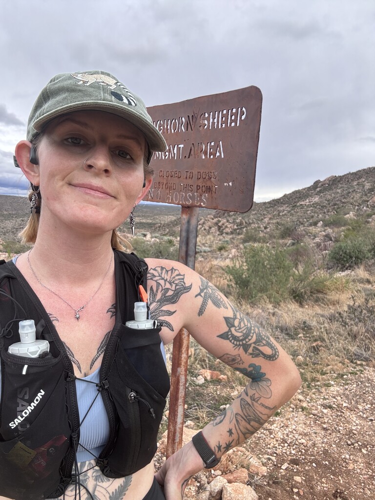 The first five miles were familiar territory, but following the gps meant running trails backwards from my usual habitual runs around the park. I found the nature trail views were better counterclockwise. Next was an out and back stretch on the canyon loop, very busy with families on a holiday weekend. I turned around at the Sutherland intersection. Then the birding loop clockwise, where I fear I disrupted a bird photographer’s bird photography. Then up the very steep dirt slope towards Romero Pools. I had made note from the gps track that I needed to go .6 miles up the Romero Pools trail from the canyon loop intersection to hit the park boundary, as Marcy mentioned the wilderness boundary sign was gone. I’m not sure if it was a different sign, but at .6 I ran into this metal bighorn sheep sign (pictured) and made that my turnaround point.