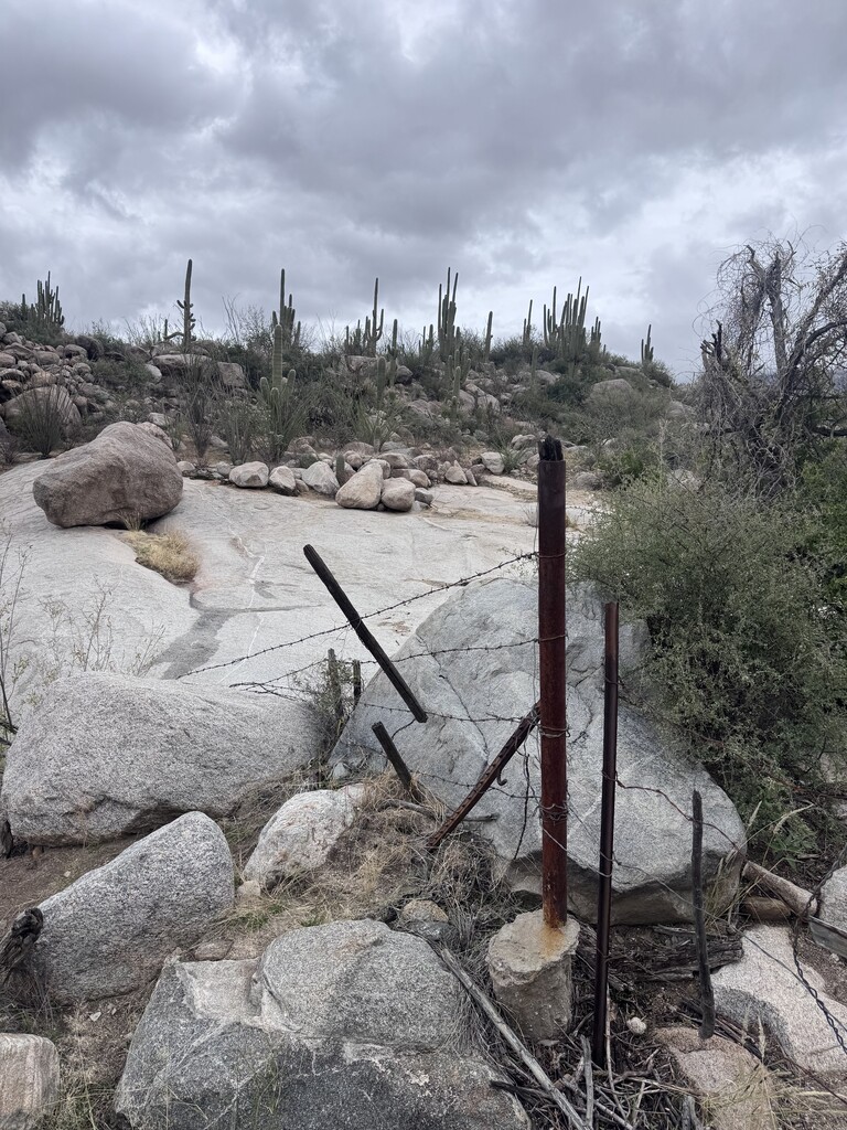 From there, I finished the canyon loop and turned right up the Sutherland trail for a steady but not too steep climb. I rounded a corner into a javelina and we both jumped. I looked around for her family, but I guess she was alone. This section of trail was very quiet and peaceful compared to the inner loops of the park. My first navigation challenge was at the park boundary, where I mistook a silly looking gate (pictured) for a fence and tried to find a trail on the inside of the fence rather than passing through the gate and crossing the wash— this was new trail to me and it took me a few minutes to realize where I needed to go.