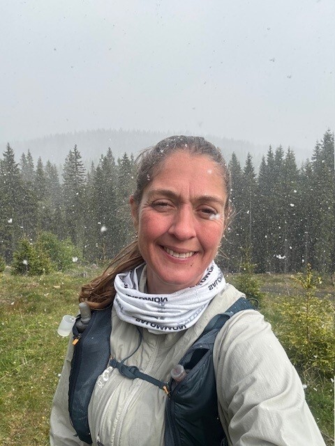 I was exited starting the run going into the night, covering the technical trails lit up by my headlamp and good motivation. The start was fun and easy, but it was not fast as the trails in Nordmarka are always more challenging than you remember. I passed by Nordmarkskapellet and Kobberhaugshytta without stopping, and had my first brake reaching Kikut. Kikut was closed, but the public warming area was open and I had my first real meal sitting down. After Kikut, the trail continued to the Kikuttoppen and the sun was rising as I reached the top. The first long strech passing by idyllic Katnosa towards Mylla, includes some summits but these are all below 700 m and does not count in the high five. On one of these, Kollern 688 m, it started to snow. The had been cold and it was frost in the grass.
