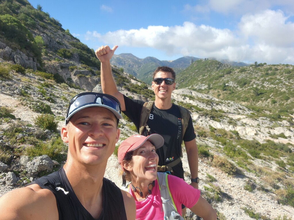 I began my run at 4am in the town square at the start of the route, launched the GPX file on my watch and on my phone, and set out on my run. The first two hours, I ran in the dark, with two friends running with me. That was a bit of a wild experience - we had several dogs start following/chasing us, we saw hundreds of glowing green eyes which turned out to be a lot of goats in a field, and we ran through some overgrown thorn bushes on the trails that cut up our legs a bit. The reward, though, was the most beautiful sunrise overlooking the ocean and villages below.