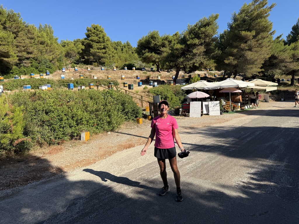 The Lefkada Trail is divided into six sections, as it is meant to be done by hikers across six days, so when we began "section 3," I switched pacers again after a slightly longer break and we began a steep single track ascent section that saw a return of hundreds of those huge spiders, some more offleash dogs, and bright sunlight beating down with very little shade. There was also a section with some cows and bulls roaming freely, so I made sure to be slow and calm through that section, as I recently had a rough encounter with a bull on a trail in Arizona. This section took quite a while as it was rocky with loose rock and had steep ascents and descents, but reaching the summit and getting to pose for a photo with the sign was extremely rewarding. I also knew that we were close to the halfway point of the trail - only about a marathon to go!