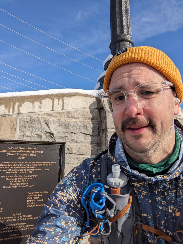 I started at 10:42 a.m. on the east side of the 10th Street Bridge, close to the MS Chi-Cheemaun docked for winter. It felt like a good omen after two great family trips on the ferry. Blue skies appeared briefly, the only time all day, with a temperature of −2 °C. About 5 cm of fresh snow covered the trail from the previous day’s storm. The route leaves town on a paved path, turning to packed gravel around 2 km along the Georgian Bluffs Trail. The rail trail was untouched snow, every step felt like double effort, and I doubted my goal time. Once off the trail and onto Range Rd, Somers St, and 19th St W, the clear roads and light traffic let me make up time.