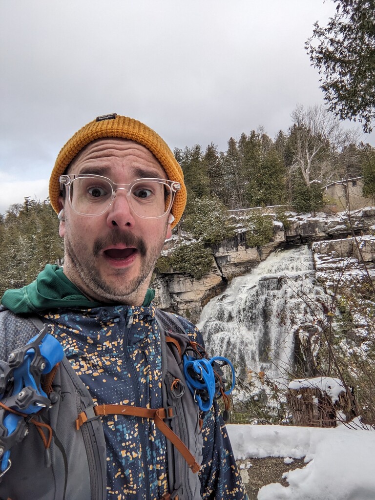 My first taste of the Bruce. A steep 30 m rocky climb, likely the toughest of the route. I made a point to power hike it conservatively and not burn excess energy. After a left turn, I followed the white blazes toward Inglis Falls, hopping over 21 crevasses with snowy slippery footing. In dry conditions, this could be much faster without the constant risk of slipping into a gap. I stayed right on the edge of reasonable risk here.