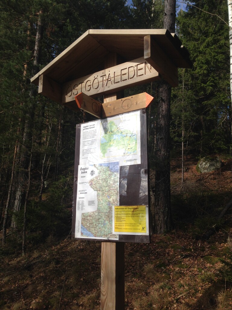 Blev avlämnad vid färjan, tog lite bilder på den slitna ledkartan vid en anslagstavla och gav mig iväg. Ganska snart vek leden av in i skogen och där var det i princip obanat mellan gamla bleka markeringar som ibland upphörde helt och man fick irra omkring ett tag.