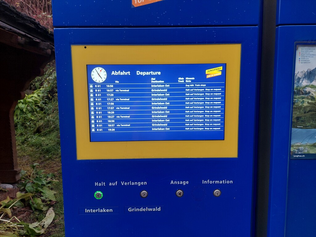 Rain (and fresh snow above 2000m) was predicted for the full day. And the Swiss weather forecast is really accurate. I started running the first two hours in pouring rain. At around 1800m height, rain turned into snow. From 2000m the snow pack became dense. I was taking much care in this avalanche prone area, where small slabs of snow started moving; I estimate some 30cm fresh snow. I put on my skiing gloves for solid placement of my hands on the mountain side of the trail. Nobody was out that day. Six chamois suddenly jumped a few meters in front of me. They were as suprised to see mee, as I was to see them. The trail was difficult to follow, but during few moments of clear view I could see the goal: Mannlichen upper ski-station. I moved forward very careful with every foot placement solid into the snow, not bothering about speed. On the top there was hard wind and horizontal snow. I kept warm by jogging downwards on the piste following the GPS-track. At around 1800m height there was a small wooden shelter, that I used to pause for a few minutes to eat and drink. Getting cold rapidly, and therefore continued running downwards. At the upper part of Grindelwald village I started to see cars and houses with lights. There I took the first pictures of the day, because I was not able to put of my gloves in the snow storm of the previous hours.