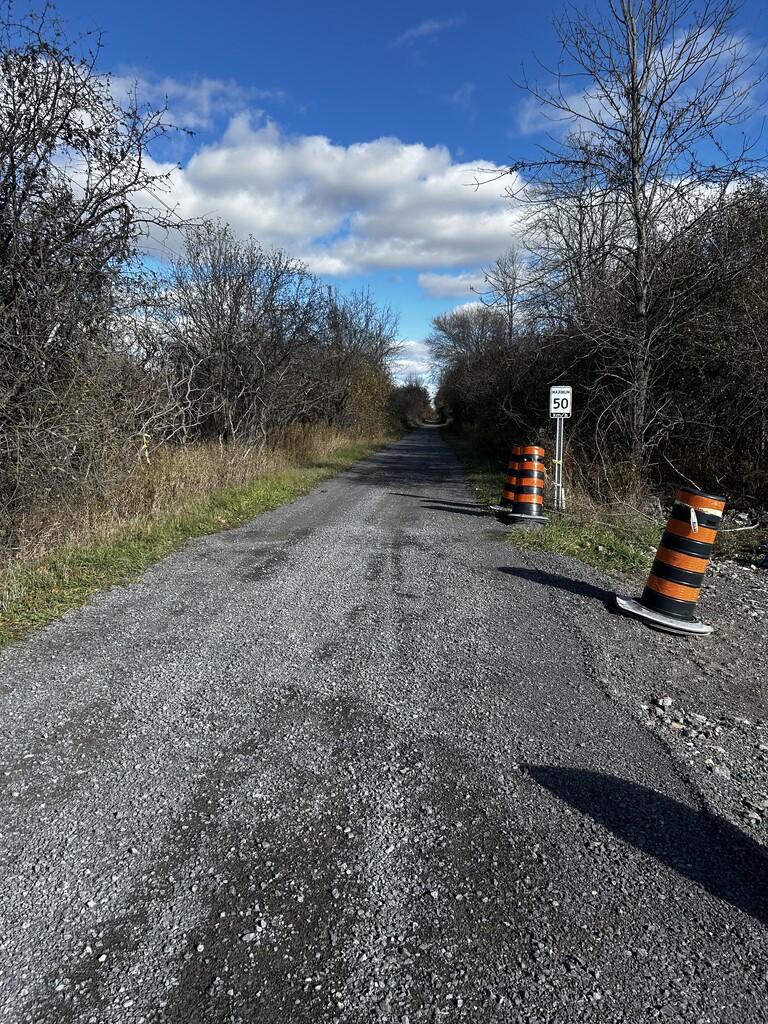 The first 2 km were rough, with coarse rock underfoot, but once I hit the official trail start, it transitioned to hard-packed crushed gravel that carried me most of the way. The first half was fairly busy with lots of walkers, ATVs, and cyclists out enjoying the day, and lots of horse manure. There was a detour in Wellington which I documented with photos, which added about 800m to the total trail based on the trail signage. After that point, the route was much quieter, and the second half of the trail was marked by large puddles that had turned into bird baths, and the unmistakable smell of manure from nearby farms. My legs were screaming toward the end, but I dug deep and kept pushing.
