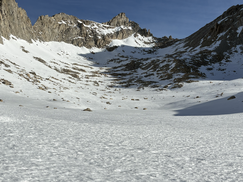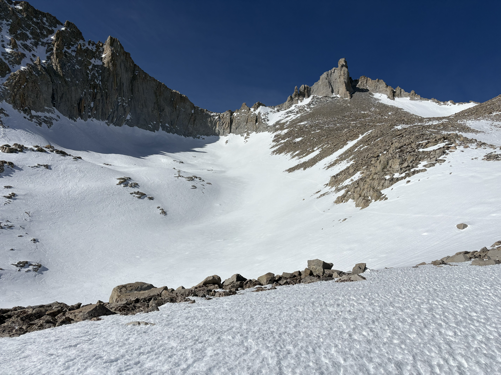 Climbing out toward Diamond Mesa in the heat of the day was, without exaggeration, one of the more miserable slogs I’ve had out there. Fully unsupported snow, collapsing every step, heat radiating like an oven. Progress slowed to a grind. Shepherd Pass sat in the distance like a bad joke that just wouldn’t land.